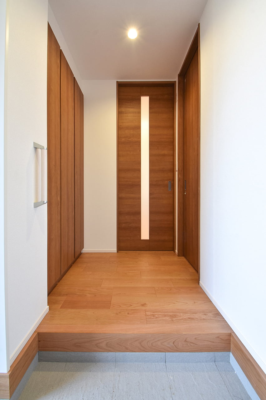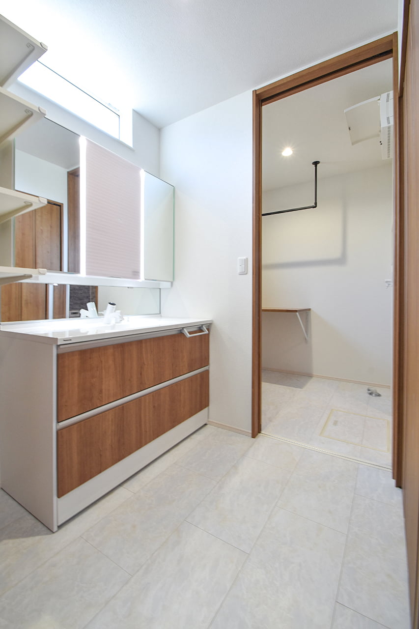 脱衣と洗面を間仕切る、機能的な独立洗面室のある家