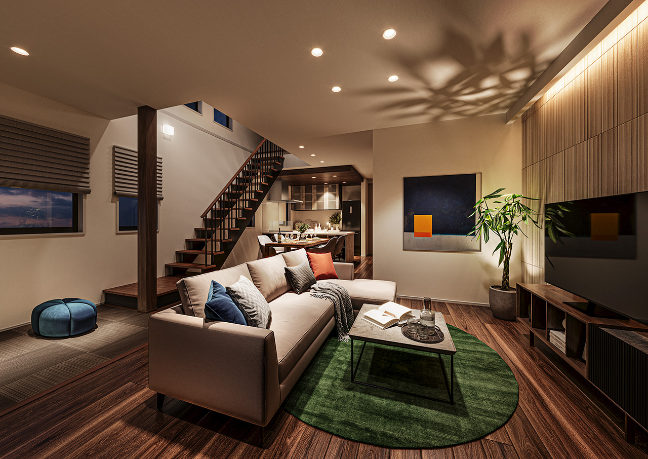 肌触りが心地いいテキスタイルをフロアに採用したリビングそばの寛ぎ空間。テキスタイルは、クッション性が高く子ども達の遊び場にもピッタリ。低い目線のロースタイルでリラックスタイムを深めたり、友人や仲間たちをおもてなしする、スタイリッシュな和モダン空間にアレンジしたり。スタイルや表現したい事で、使い方が多彩に広がる空間です。