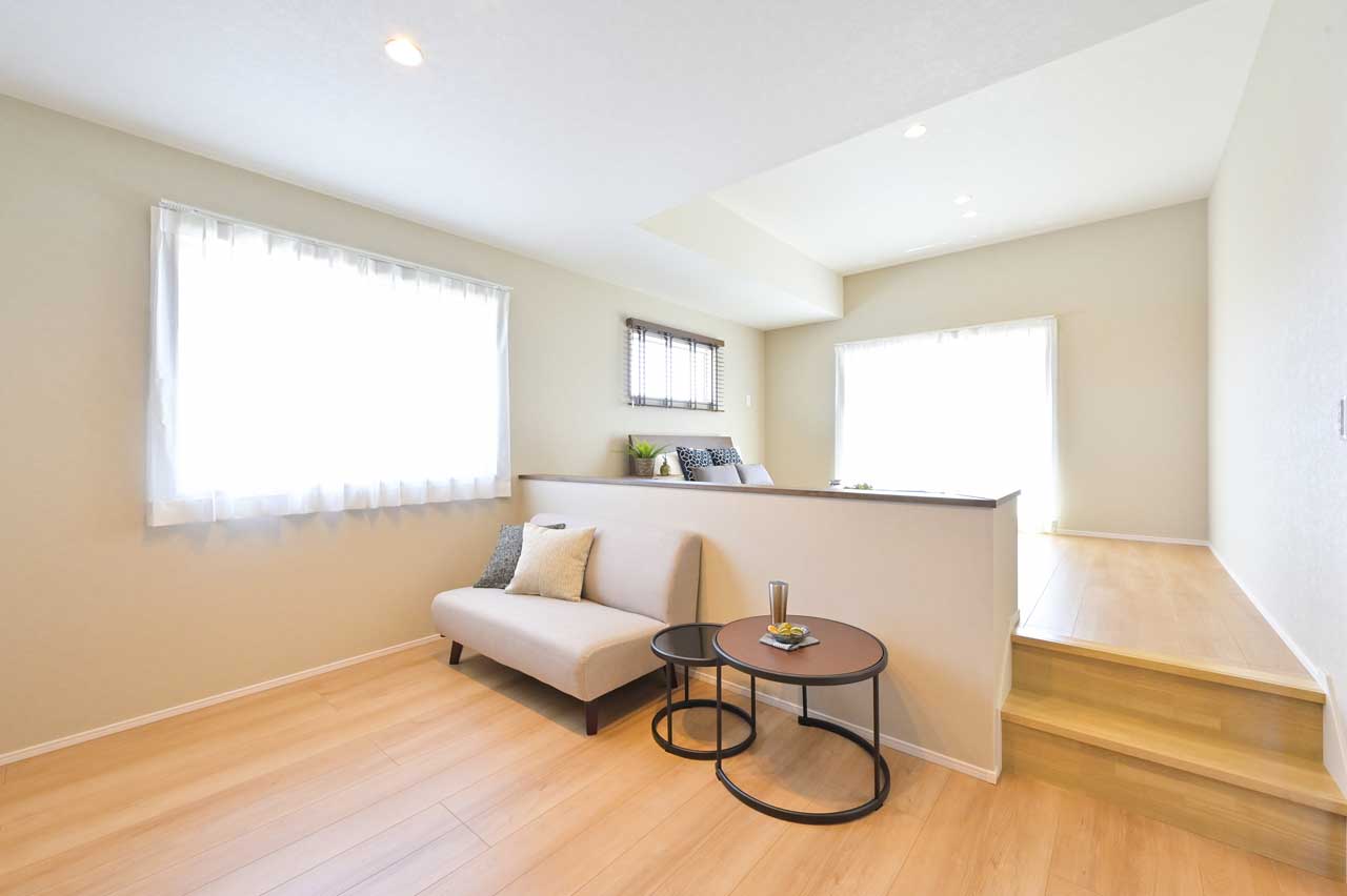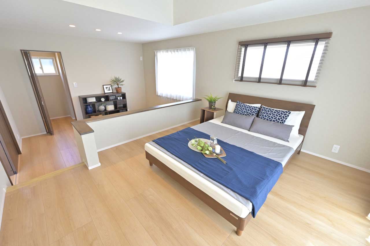 【2階】主寝室に段差を設け、スキップフロア仕様にしました。それぞれの目線の違いが、一つの空間を程よくセパレートし、寝室に新たな空間を創出。まるでリゾートホテルの居室を思わせる上質な居心地をお楽しみいただけます。