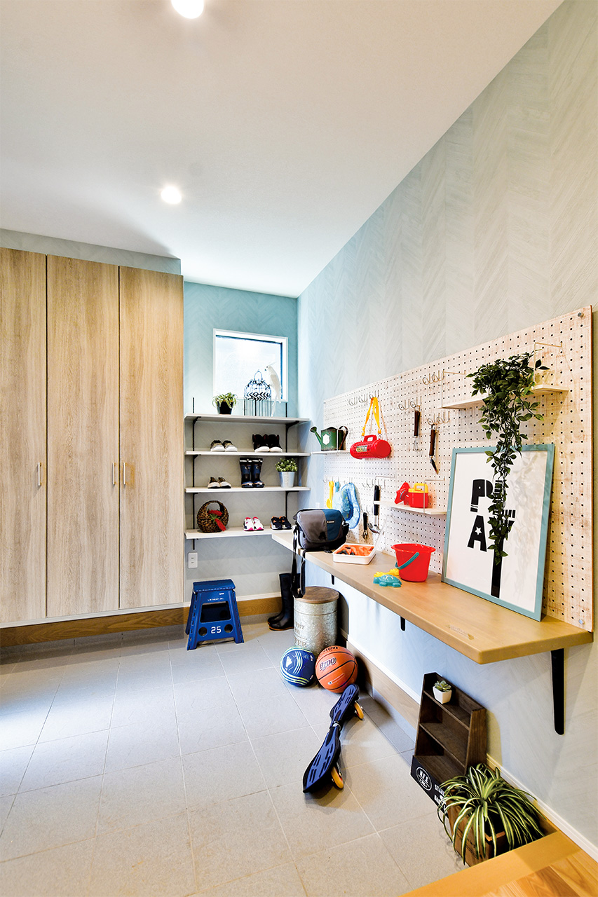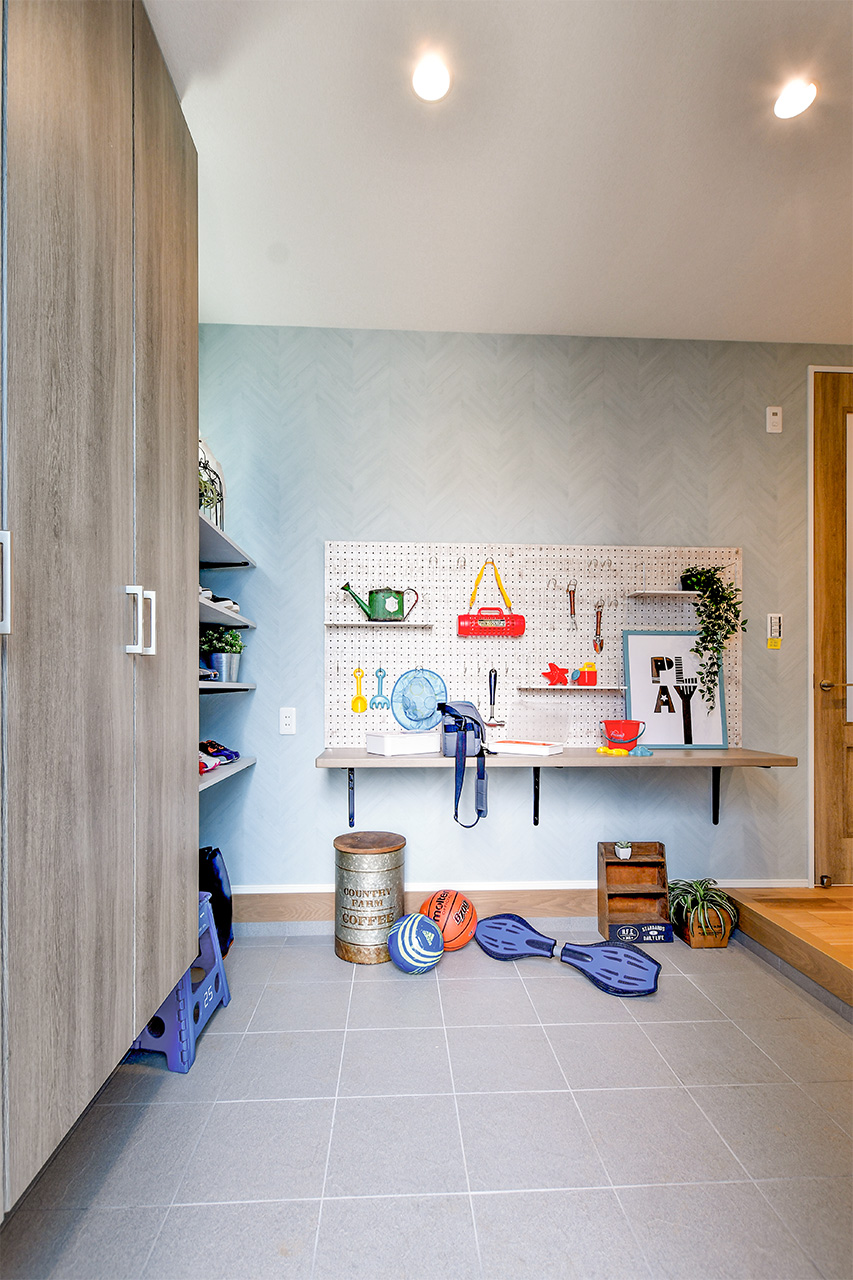 広々とした玄関にあるカウンターには、アウトドアギアなどの趣味の工具や、お気に入りの雑貨を飾って楽しんで。