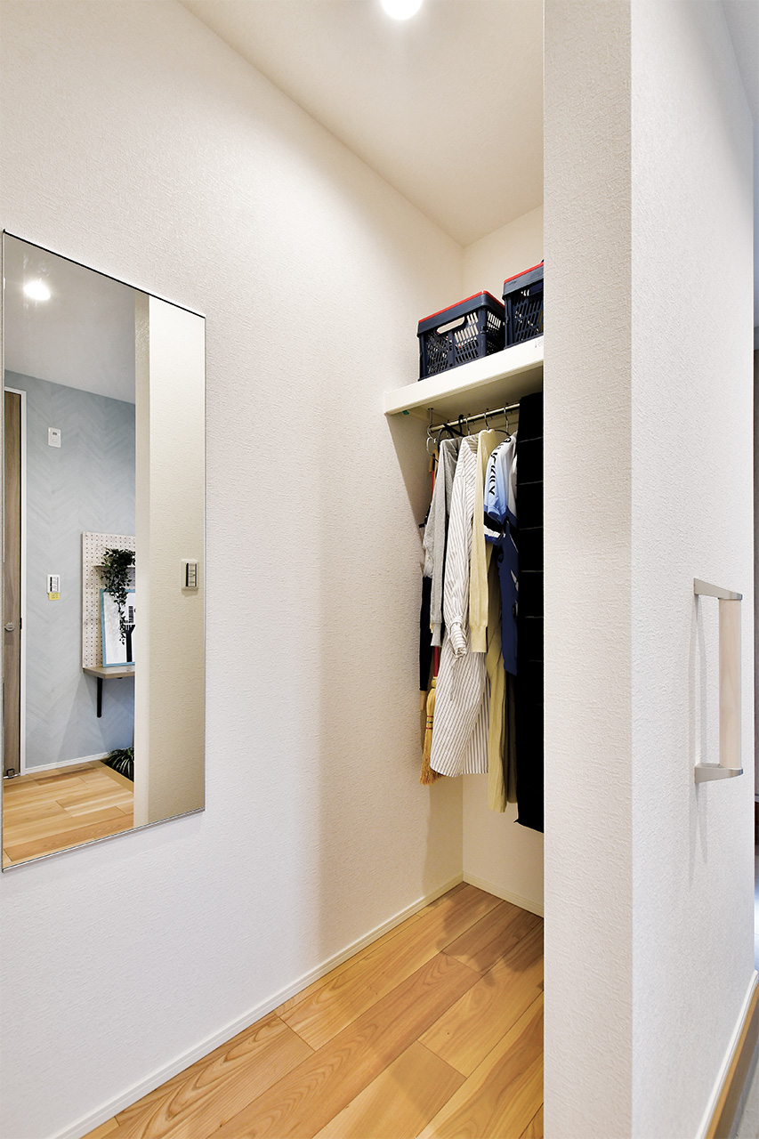 お出かけ前にはエントランスクロークにあるミラーで全身チェック。