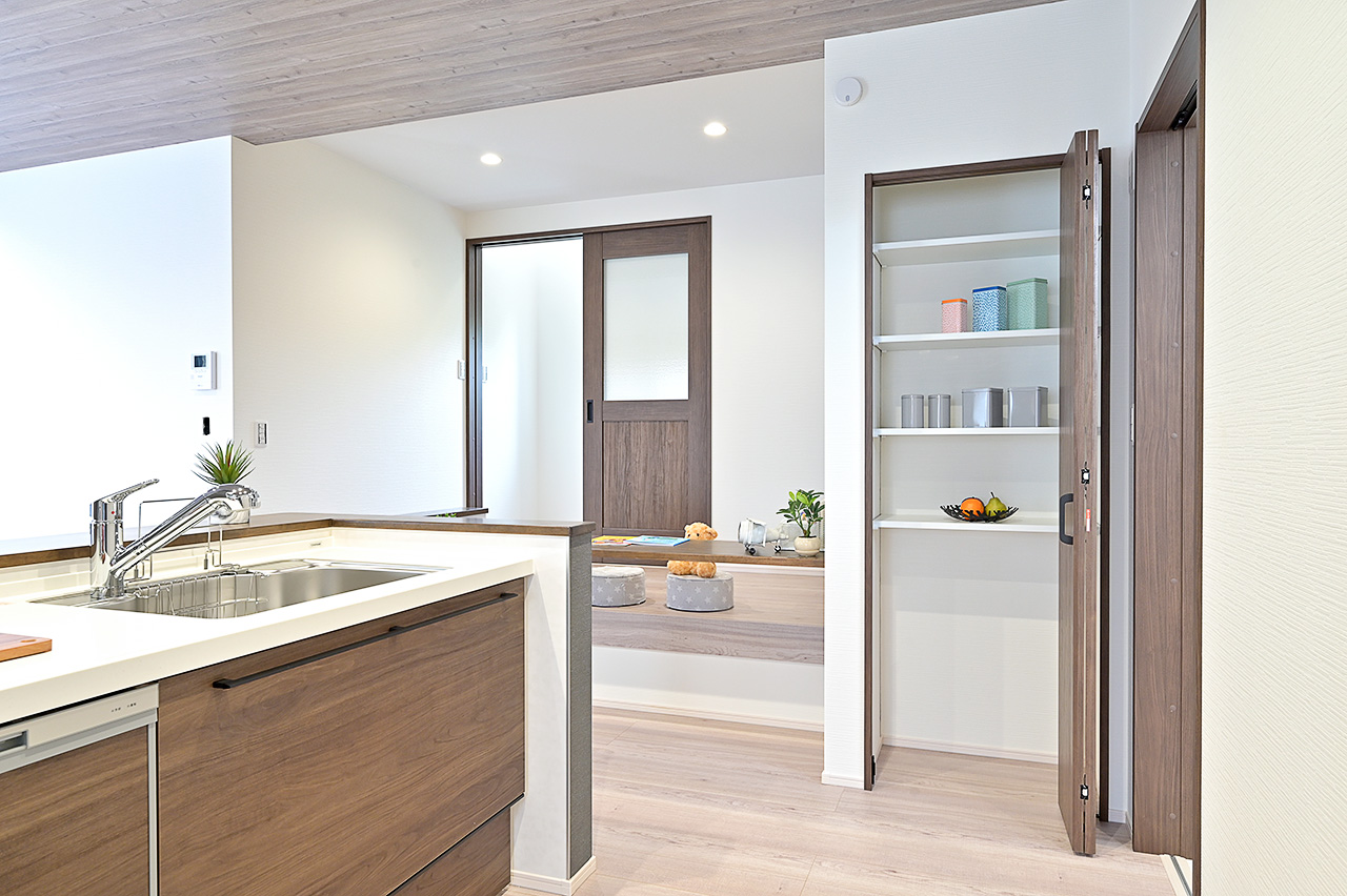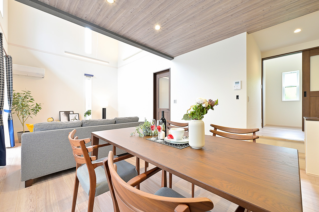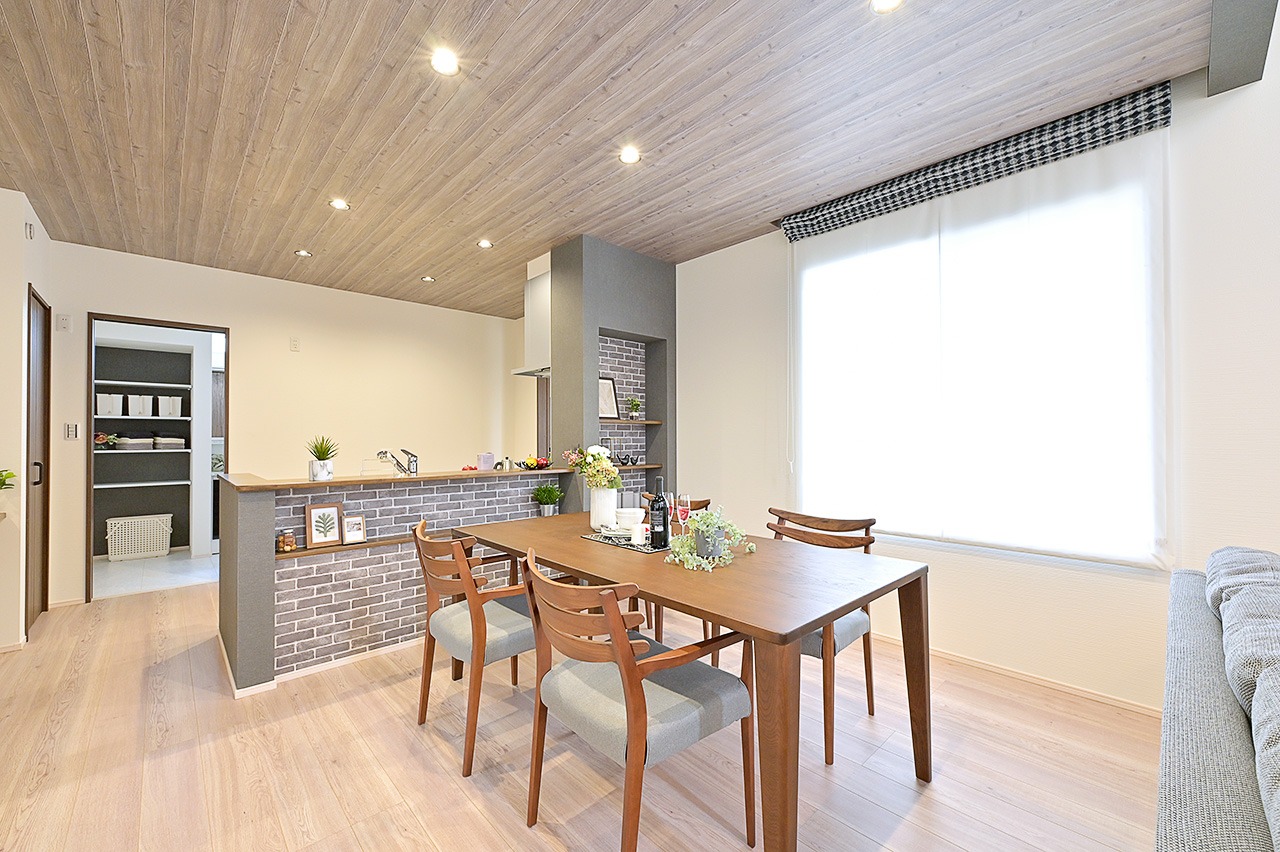 木目調のクロス、ホワイトアッシュで統一したフロアの素材感が空間にぬくもりと落ち着いた雰囲気を表現。