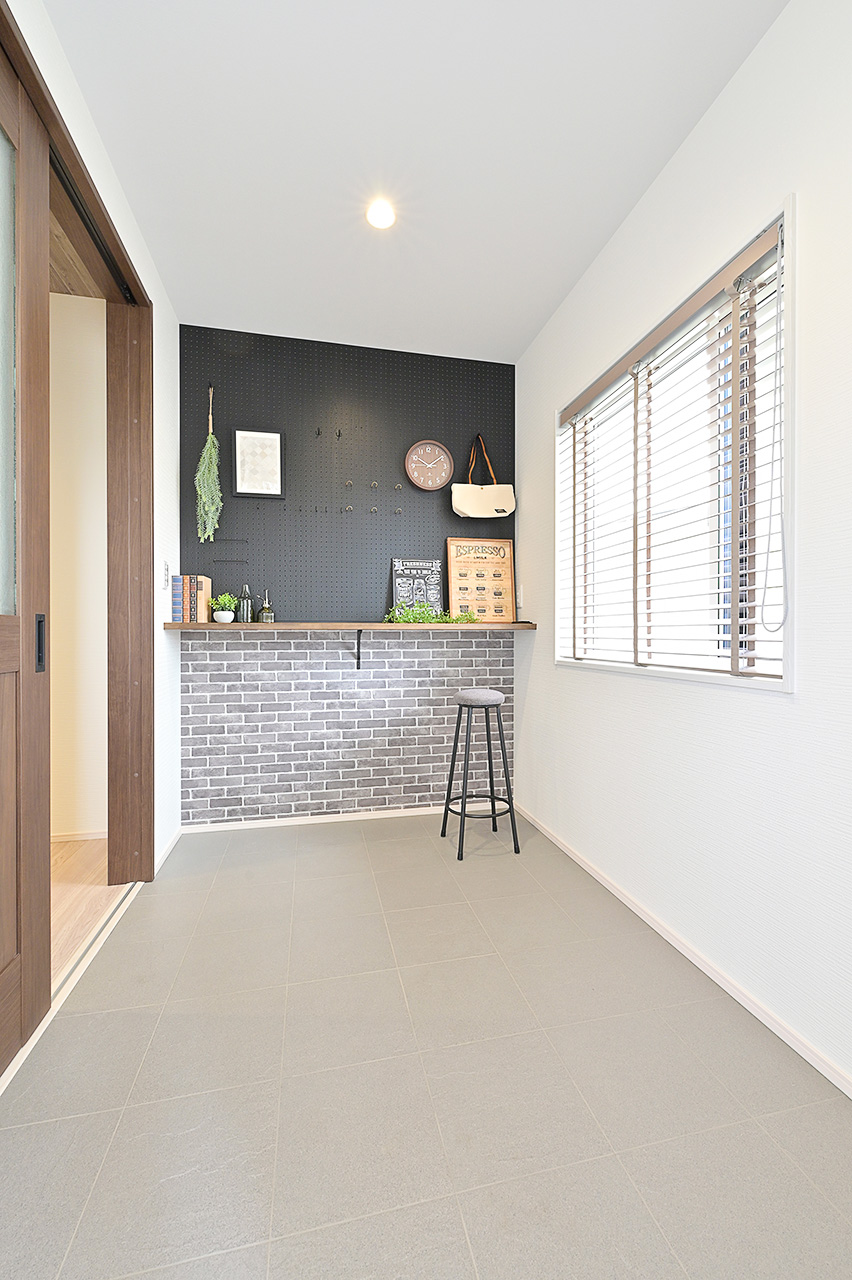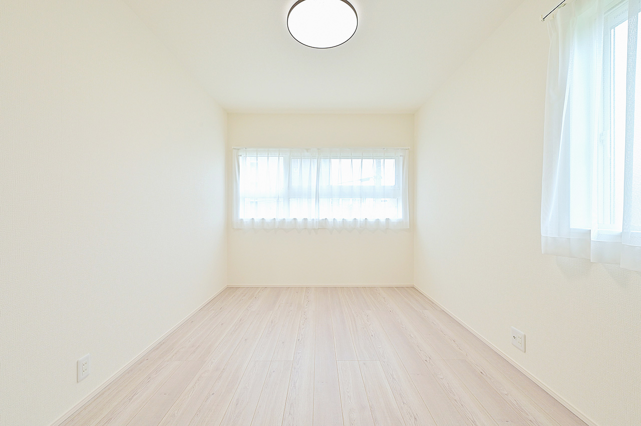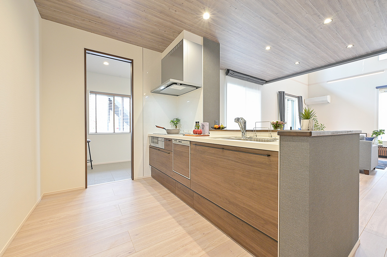 木目調のクロス、ホワイトアッシュで統一したフロアの素材感が空間にぬくもりと落ち着いた雰囲気を表現。
