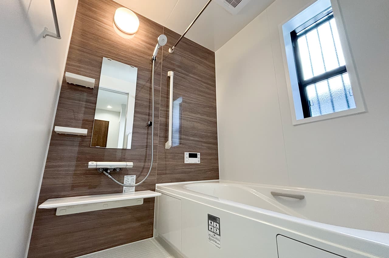 簡素になりがちなバスルームこそ、壁紙に彩りを。ぬくもりを感じる空間でほっと一息リラックス。