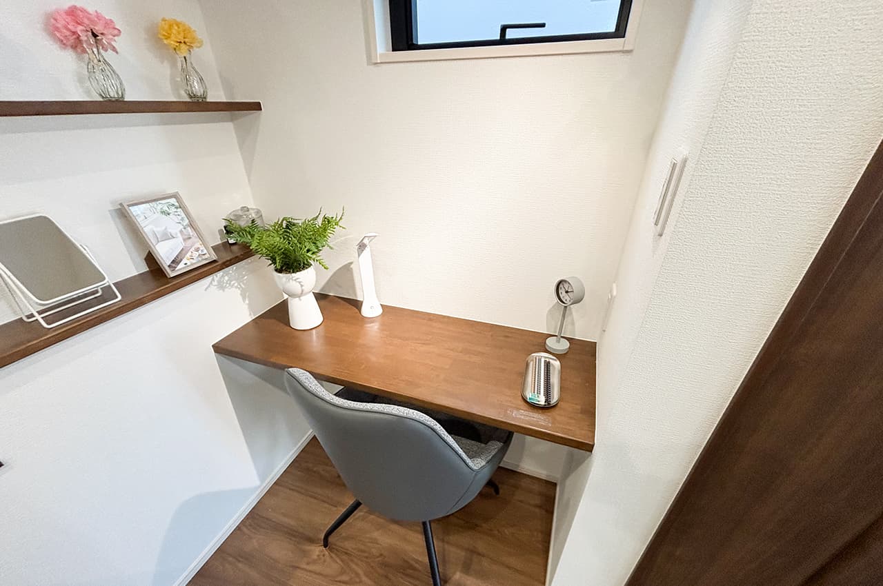 キッチンから見やすい場所にあるカウンタースペース。リビング学習スペースや在宅ワークにちょうどいいです。