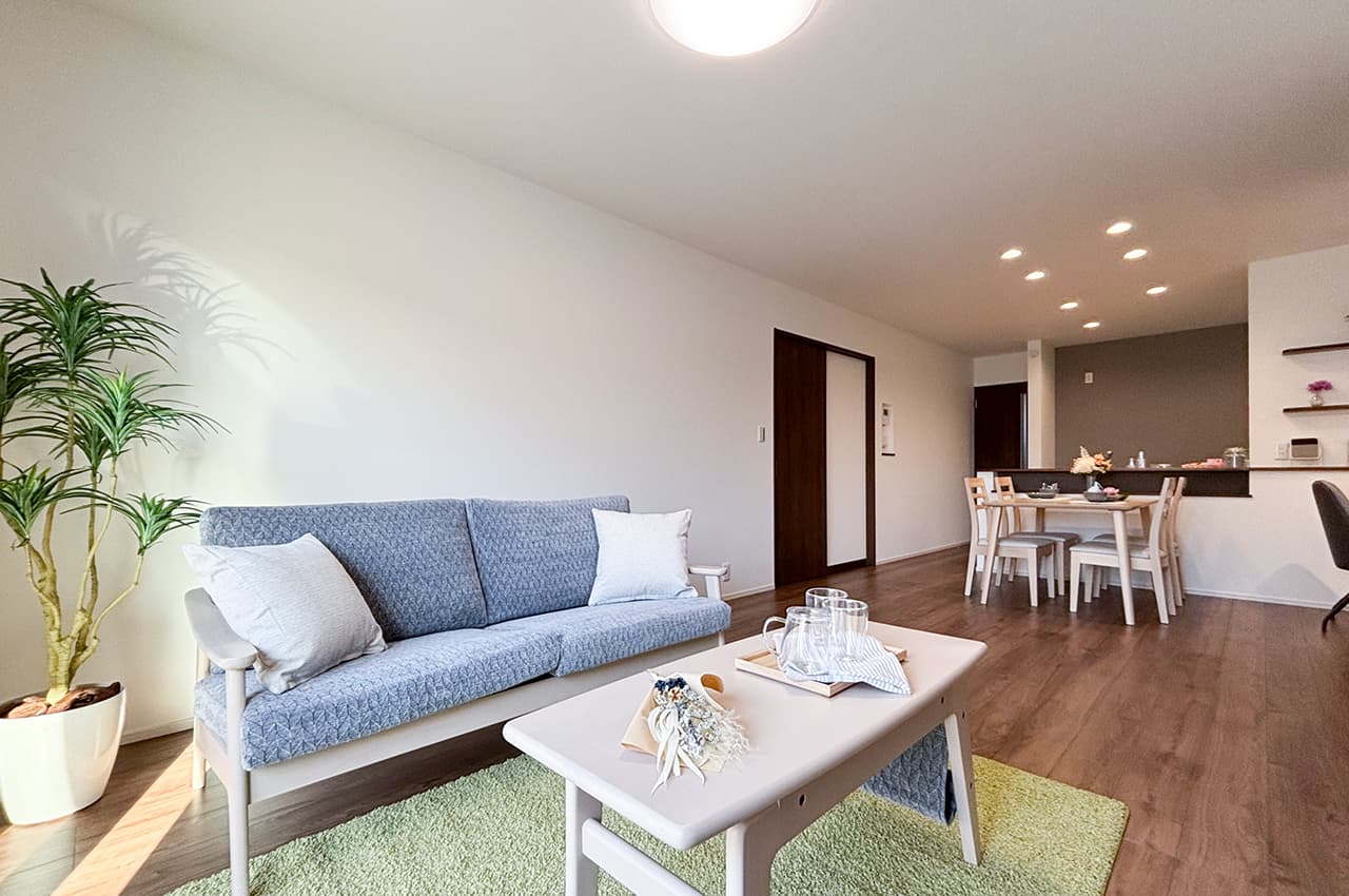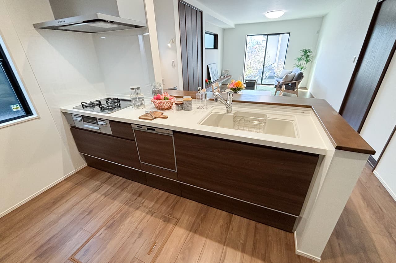 LDKを広く見せる、対面キッチン。床材の向きも長手方向に貼って広く見えるようにしています。