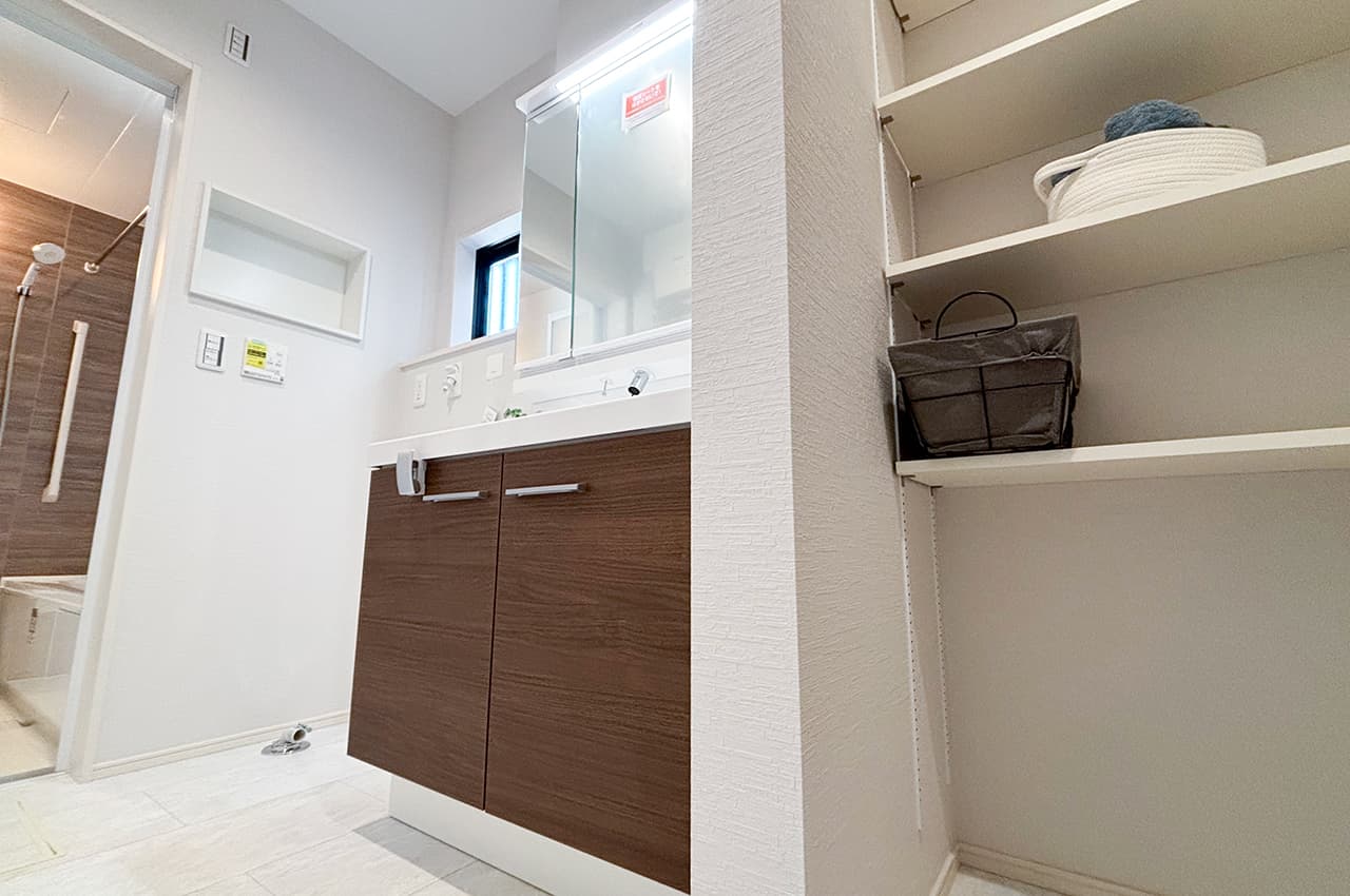 洗面室には便利なリネン庫も設置。タオルなどのリネン類や洗剤のストックなどをすっきり収納できます。