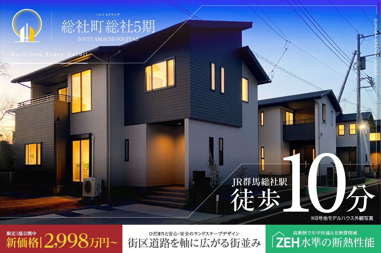 360°モデルハウス見学|群馬グランディハウス 10件の分譲地、13件のプランが見つかりました。 エリア絞込: すべて 前橋市 高崎市 伊勢崎市 太田市 すべての物件にチェックを入れる すべてチェック 物件をくらべる まとめて資料請求する 0件の分譲地 物件をくらべる(5件まで) まとめて資料請求する(5件まで) モデルハウス 高崎市 下之城町 セントラルグランドシティ下之城 ハイグレードモデルハウス3邸公開中 全邸長期優良住宅、ZEH水準の断熱性能 ◆再開発で新たな街づくりが進む区画整理事業地 販売戸数:8戸 お気に入り登録人数3人 お気に入り登録 販売価格 4,080万円 (税込) 〜 沿線&最寄り駅 JR高崎線|高崎駅 約3,700m 〜 約4,000m 市内循環バス ぐるりん|倉賀野町西上正六停留所 徒歩 2分( 約100m ) 〜 徒歩 5分( 約400m ) 小学校区 佐野小学校 土地面積 180.18㎡(54.50坪)〜 186.41㎡(56.38坪) 建物面積 91.78㎡(27.70坪)〜 127.19㎡(38.39坪) 入居予定時期 即入居可、2026年3月上旬 大型分譲地 動画 パノラマ 即入居可 写真公開・更新 オール電化 来場予約 資料請求(無料) 電話相談 お問い合わせ 群馬グランディハウス 高崎本社 高崎市江木町302番地5 0120793311(発信する) 閉じる 分譲地詳細を見る プラン詳細・間取り(3件) モデルハウス 50号地 吹抜け天井を備えた18.5帖超のLDKに、アイランドキッチンを採用したモデルハウスプラン 販売価格 お問い合わせください 土地面積 180.18㎡(54.50坪) 建物面積 127.19㎡(38.39坪) フリースペース 吹抜け お手伝いキッチン オープンキッチン ファミリークローク シューズクローク インナーバルコニー リネン庫 パントリー 間接照明 LDK18帖以上 タッチレス水栓 電動シャッター 玄関電子錠 制震ダンパー「K3」 角地 南面道路 駐車場2台以上 モデルハウス 44号地 ご家族の団らんや寛ぎの中心となるリビング空間を際立たせる吹抜け天井プラン 販売価格 お問い合わせください 土地面積 180.22㎡(54.51坪) 建物面積 114.21㎡(34.48坪) 吹抜け フリースペース シューズクローク 独立洗面 ウォークインクローゼット パントリー ただいまクローク 電動シャッター タッチレス水栓 玄関電子錠 制震ダンパー「K3」 駐車場2台以上 角地 南面道路 動画 34号地 Grandy×STYLE コラボモデルハウス、勾配天井を設えた平屋プラン 販売価格 お問い合わせください 土地面積 180.22㎡(54.51坪) 建物面積 91.78㎡(27.70坪) LDK18帖以上 勾配天井 リビングコンテナ 独立洗面 シューズクローク パントリー リネン庫 電動シャッター タッチレス水栓 玄関電子錠 制震ダンパー「K3」 駐車場2台以上 角地 南面道路 価格改定 モデルハウス 高崎市 倉賀野町 グランプレミアム倉賀野 最終1邸|オプション工事の中から ご成約で100万円相当プレゼント 新価格物件公開中 ◆長期優良住宅認定、全15邸の大型分譲プロジェクト ◆ZEH水準の断熱・省エネルギー性能×オール電化の住まい ◆宅配ボックス/玄関ドア「ポケットキー」/電動シャッターを採用 ※ZEH水準の性能を自社で判定しています 販売戸数:1戸 お気に入り登録人数3人 お気に入り登録 販売価格 3,090万円 (税込) 沿線&最寄り駅 JR高崎線|倉賀野駅 徒歩 25分( 約2,000m ) 〜 徒歩 27分( 約2,100m ) 市内循環バス ぐるりん|倉賀野町正六停留所 徒歩 3分( 約200m ) 〜 徒歩 4分( 約300m ) 小学校区 倉賀野小学校 土地面積 196.41㎡(59.41坪) 建物面積 107.09㎡(32.33坪) 入居予定時期 即入居可 パノラマ 即入居可 写真公開・更新 オール電化 来場予約 資料請求(無料) 電話相談 お問い合わせ 群馬グランディハウス 高崎本社 高崎市江木町302番地5 0120793311(発信する) 閉じる 分譲地詳細を見る プラン詳細・間取り(1件) 価格改定 モデルハウス 15号地 開放的な吹抜けLDKに、天候を気にせず洗濯できるサンルームを備えた暮らし 販売価格 3,090万円(税込) 土地面積 196.41㎡(59.41坪) 建物面積 107.09㎡(32.33坪) 吹抜け サンルーム LDK18帖以上 フリースペース ただいまクローク インナーバルコニー パントリー リネン庫 駐車場2台以上 電動シャッター 玄関電子錠 価格改定 モデルハウス 高崎市 下小鳥町 グランプレミアム下小鳥町4期 限定2邸|新価格公開中 太陽光搭載キャンペーン対象 ◆保育園・幼稚園・小学校まで1km圏内 ◆全邸南面玄関、明るさと開放感の全3邸 ◆高崎環状線・国道17号線そばの好立地 ◆ZEH水準の断熱・省エネ性能×オール電化の住まい ◆タッチレス水栓/宅配ボックス/玄関ドア電子キー/電動シャッター搭載 販売戸数:3戸 お気に入り登録人数人 お気に入り登録 販売価格 3,090万円 (税込) 〜 沿線&最寄り駅 JR信越本線|北高崎駅 徒歩 25分( 約2,000m ) 〜 徒歩 26分( 約2,030m ) 群馬バス|下小鳥停留所 徒歩 3分( 約180m ) 〜 徒歩 3分( 約210m ) 小学校区 六郷小学校 土地面積 159.79㎡(48.33坪)〜 167.92㎡(50.79坪) 建物面積 106.28㎡(32.08坪)〜 108.77㎡(32.83坪) 入居予定時期 即入居可 パノラマ 太陽光発電搭載 即入居可 写真公開・更新 オール電化 来場予約 資料請求(無料) 電話相談 お問い合わせ 群馬グランディハウス 高崎本社 高崎市江木町302番地5 0120793311(発信する) 閉じる 分譲地詳細を見る プラン詳