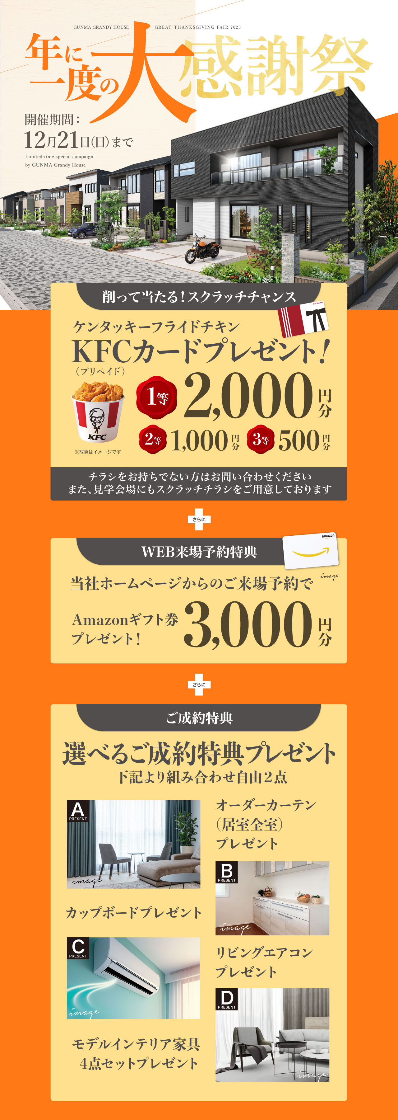 ご来場・ご成約特典|群馬グランディハウス 27件の分譲地、94件のプランが見つかりました。 エリア絞込: すべて 前橋市 高崎市 伊勢崎市 太田市 すべての物件にチェックを入れる すべてチェック 物件をくらべる まとめて資料請求する 0件の分譲地 物件をくらべる(5件まで) まとめて資料請求する(5件まで) 前橋市 文京町 ソレイユグランデ文京町3丁目 お気に入り登録人数1人 販売戸数: 1戸 販売価格: 4,280万円 (税込) けやきウォーク徒歩圏の前橋中心部 ハイグレード仕様|最終1邸 ◆リビング空間を際立たせる吹抜け天井の限定2邸 ◆「けやきウォーク前橋」まで約1120m ◆天川小学校まで徒歩5分 ◆ファミリーコーナーやフリースペースなど自分時間や寛ぎを支える邸別プラン ◆ZEH水準の断熱・省エネ性能×オール電化の住まい ◆タッチレス水栓/人大シンク/タンクレストイレ採用のハイグレード設備仕様 ◆宅配ボックス/玄関ドア電子キー/電動シャッター搭載 来場予約 資料請求(無料) 電話相談 お問い合わせ 群馬グランディハウス 高崎本社 高崎市江木町302番地5 0120793311(発信する) 閉じる 分譲地詳細を見る モデルハウス 前橋市 箱田町 ファミリーキャッスル箱田町3期 お気に入り登録人数1人 販売戸数: 2戸 販売価格: 3,380万円 (税込) いよいよ最終2邸 ◆子育て施設が約590m圏内 ◆「フォレストモール」や「けやきウォーク前橋」などの商業施設も普段使いのエリア ◆ZEH水準の断熱・省エネルギー性能×オール電化の住まい ◆玄関ドア電子錠/電動シャッター搭載/宅配ボックス採用 来場予約 資料請求(無料) 電話相談 お問い合わせ 群馬グランディハウス 高崎本社 高崎市江木町302番地5 0120793311(発信する) 閉じる 分譲地詳細を見る モデルハウス 前橋市 駒形町 ソレイユグランデ駒形町2期 お気に入り登録人数3人 販売戸数: 3戸 販売価格: 3,180万円 (税込) 〜 駒形駅まで約1200m 全邸建物完成見学会開催 ◆吹抜け天井をはじめ、スキップフロアなどを採用した「光と寛ぎ」のインナーデザイン ◆JR両毛線「駒形駅」も北関東自動車道「駒形IC」も程近いアクセス良好な環境 ◆前橋中心部や伊勢崎宮子地区の大型商業施設が普段使いできる距離に充実 ◆教育施設が身近に整う住環境 ◆ZEH水準の断熱・省エネルギー性能×オール電化の住まい ◆宅配ボックス/玄関ドア電子錠/電動シャッター搭載 来場予約 資料請求(無料) 電話相談 お問い合わせ 群馬グランディハウス 高崎本社 高崎市江木町302番地5 0120793311(発信する) 閉じる 分譲地詳細を見る 新着 伊勢崎市 安堀町 クルールヴィル伊勢崎市安堀町5期 お気に入り登録人数人 販売戸数: 4戸 販売価格: 3,380万円 (税込) 〜 平屋&2階建て 多彩なライフスタイルを叶える街 ◆ショッピングモール「フォリオ安堀」まで約600m、お店や育児・医療施設が充実 ◆家事効率UPの動線設計や寛ぎスペースを配置した、ライフスタイルに合わせて選べる多彩なプランニング ◆長期優良住宅・ZEH水準の断熱・省エネ性能×オール電化の住まい ◆宅配ボックス/玄関ドア電子キー/電動シャッター搭載 来場予約 資料請求(無料) 電話相談 お問い合わせ 群馬グランディハウス 伊勢崎支店 伊勢崎市太田町1135番地1 0120078811(発信する) 閉じる 分譲地詳細を見る モデルハウス 伊勢崎市 宮前町 ソレイユグランデ伊勢崎市宮前町 お気に入り登録人数2人 販売戸数: 5戸 販売価格: 3,250万円 (税込) 〜 全邸吹抜天井採用プラン モデルハウス完成見学会開催 ◆住まいの隣に公園が位置し、商業施設も近隣に整う安心の住環境 ◆ZEH水準の断熱・省エネ性能×オール電化の住まい ◆全邸吹抜リビング・収納充実で視界の広がる快適な住まい ◆宅配ボックス/玄関ドア電子キー/電動シャッター搭載 来場予約 資料請求(無料) 電話相談 お問い合わせ 群馬グランディハウス 伊勢崎支店 伊勢崎市太田町1135番地1 0120078811(発信する) 閉じる 分譲地詳細を見る 新着 伊勢崎市 宮前町 グランドステージ伊勢崎市宮前町2期 お気に入り登録人数人 販売戸数: 6戸 販売価格: 2,990万円 (税込) 〜 全邸LDK18帖以上 学育・育児施設が約1km圏内 ◆殖蓮第二小学校約840mをはじめ、学育・育児施設が約1km圏内の充実の子育てロケーション ◆伊勢崎ショッピングモールが徒歩8分圏内 ◆「新伊勢崎」駅約1000m、国道462号線や主要県道すぐそばの利便性 ◆移動距離をスムーズに促す動線設計や憩いを育むプランニング全6邸 ◆長期優良住宅・ZEH水準の断熱・省エネ性能×オール電化の住まい ◆宅配ボックス/玄関ドア電子キー/電動シャッター搭載 来場予約 資料請求(無料) 電話相談 お問い合わせ 群馬グランディハウス 伊勢崎支店 伊勢崎市太田町1135番地1 0120078811(発信する) 閉じる 分譲地詳細を見る 新着 伊勢崎市 田部井町 ステーションコート田部井町1丁目2期 お気に入り登録人数人 販売戸数: 5戸 販売価格: 2,780万円 (税込) 〜 JR両毛線「国定」駅から徒歩約3分 長期優良×制震住宅 ◆利便も自然も暮らしのそばに「駅近徒歩3分×自然豊かな国定公園徒歩4分」 ◆カフェカウンターやリビングコンテナ