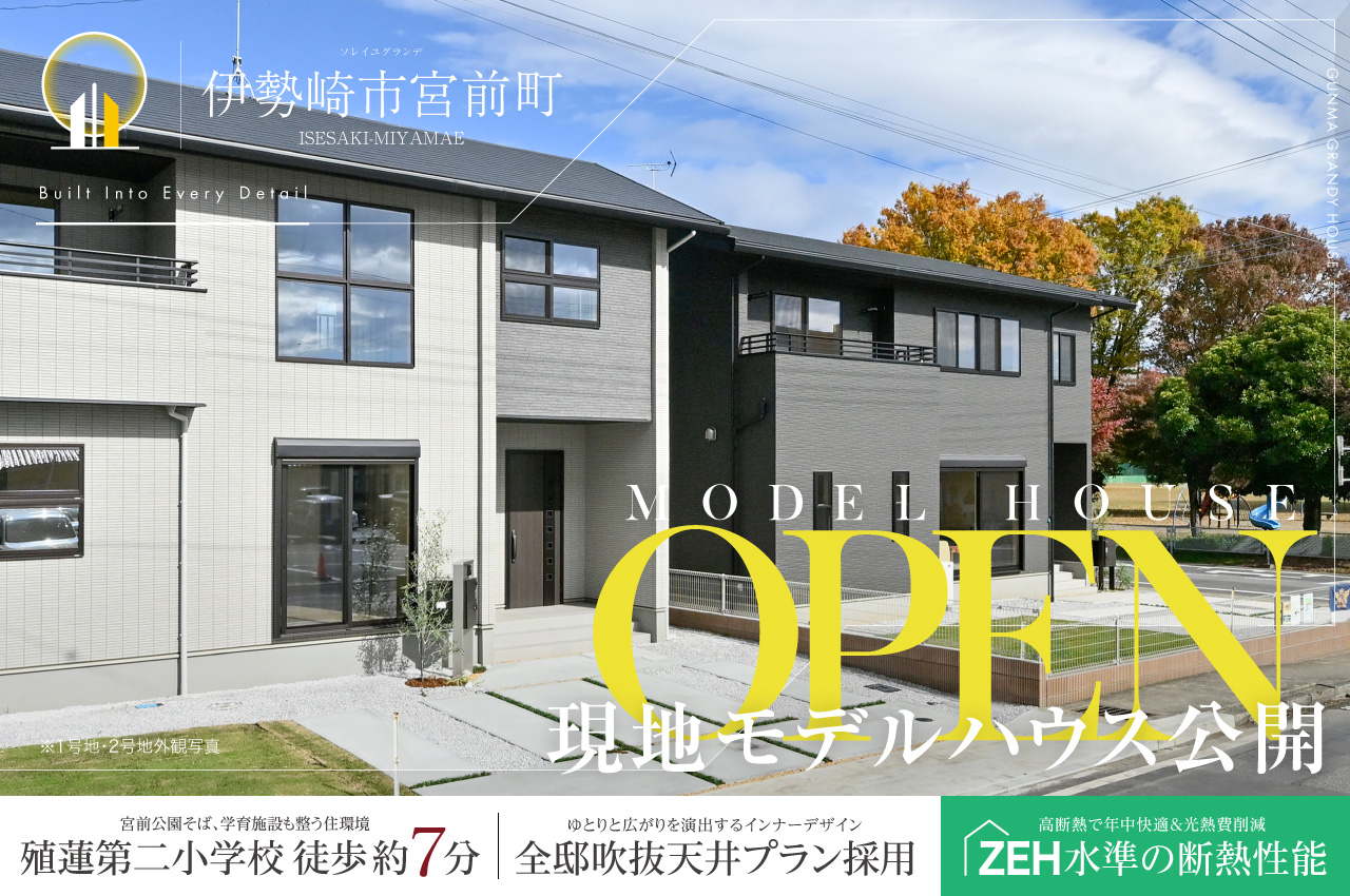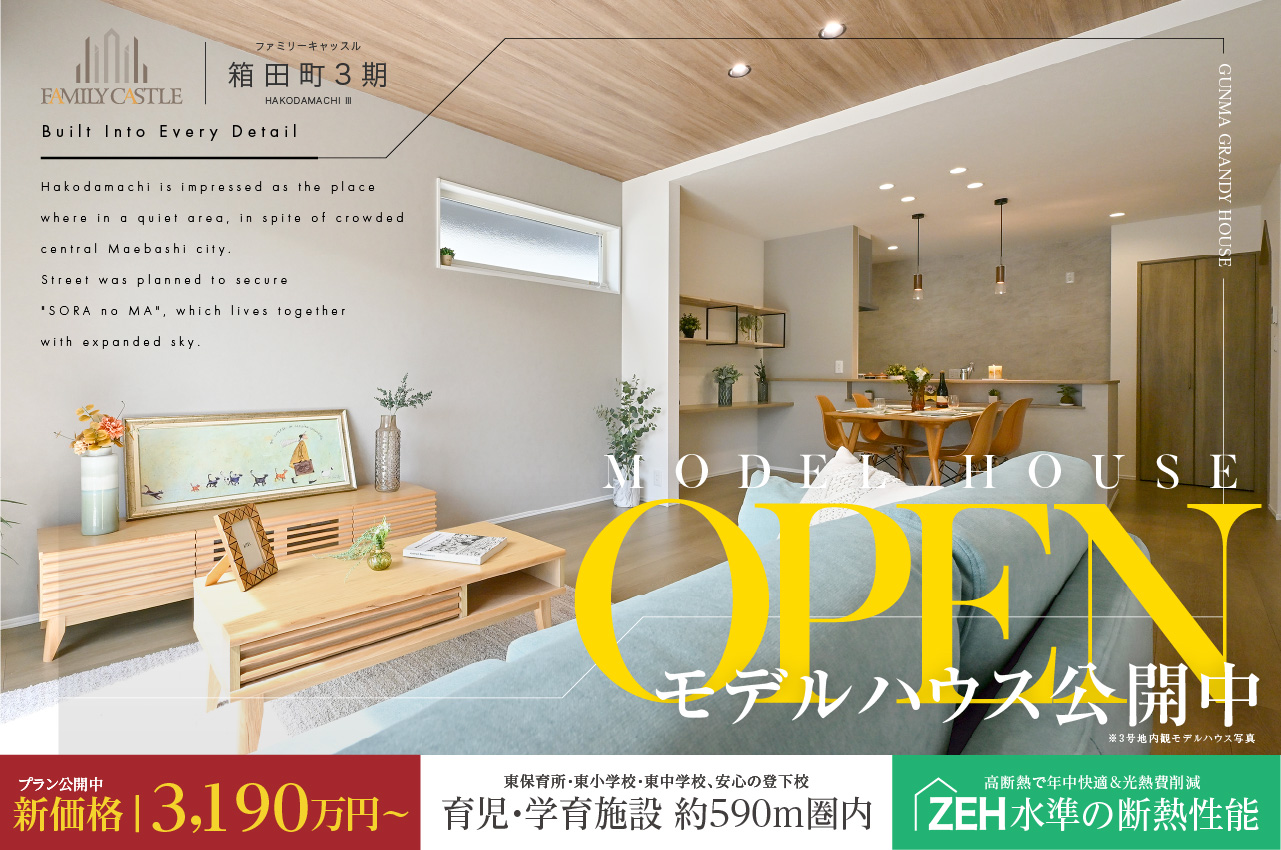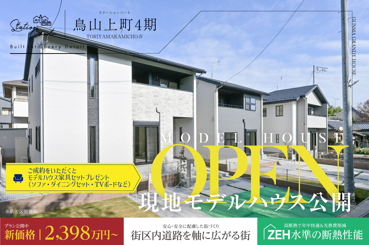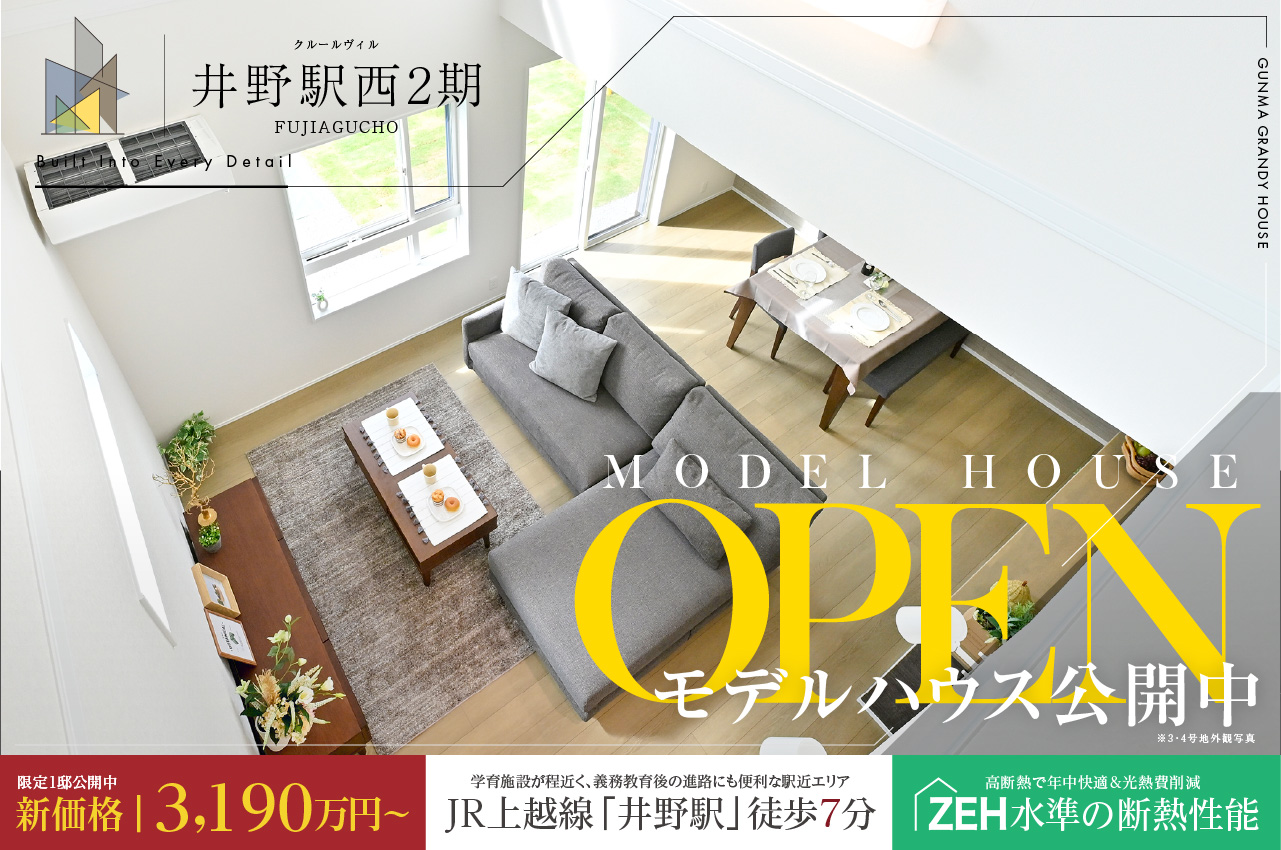 完成物件特集|群馬グランディハウス 11件の分譲地、25件のプランが見つかりました。 エリア絞込: すべて 前橋市 高崎市 伊勢崎市 太田市 すべての物件にチェックを入れる すべてチェック 物件をくらべる まとめて資料請求する 0件の分譲地 物件をくらべる(5件まで) まとめて資料請求する(5件まで) 価格改定 モデルハウス 高崎市 倉賀野町 グランプレミアム倉賀野 最終2邸|新価格公開中 WEBご来場予約で1万円分の ギフト券プレゼント! ◆長期優良住宅認定、全15邸の大型分譲プロジェクト ◆ZEH水準の断熱・省エネルギー性能×オール電化の住まい ◆宅配ボックス/玄関ドア「ポケットキー」/電動シャッターを採用 ※ZEH水準の性能を自社で判定しています 販売戸数:2戸 お気に入り登録人数3人 お気に入り登録 販売価格 3,190万円 (税込) 〜 沿線&最寄り駅 JR高崎線|倉賀野駅 徒歩 25分( 約2,000m ) 〜 徒歩 27分( 約2,100m ) 市内循環バス ぐるりん|倉賀野町正六停留所 徒歩 3分( 約200m ) 〜 徒歩 4分( 約300m ) 小学校区 倉賀野小学校 土地面積 179.48㎡(54.29坪)〜 196.41㎡(59.41坪) 建物面積 107.09㎡(32.33坪)〜 114.49㎡(34.56坪) 入居予定時期 即入居可 即入居可 写真公開・更新 オール電化 来場予約 資料請求(無料) 電話相談 お問い合わせ 群馬グランディハウス 高崎本社 高崎市江木町302番地5 0120793311(発信する) 閉じる 分譲地詳細を見る プラン詳細・間取り(2件) 7号地 雨天も安心の室内干しスペース「コモレビ空間」や適材適所の収納を備える家事楽プラン 販売価格 お問い合わせください 土地面積 179.48㎡(54.29坪) 建物面積 114.49㎡(34.56坪) LDK18帖以上 コモレビ空間 ウォークインクローゼット シューズクローク ただいまクローク パントリー 電動シャッター 玄関電子錠 駐車場2台以上 角地 価格改定 モデルハウス 15号地 開放的な吹抜けLDKに、天候を気にせず洗濯できるサンルームを備えた暮らし 販売価格 3,190万円(税込) 土地面積 196.41㎡(59.41坪) 建物面積 107.09㎡(32.33坪) 吹抜け サンルーム LDK18帖以上 フリースペース ただいまクローク インナーバルコニー パントリー リネン庫 駐車場2台以上 電動シャッター 玄関電子錠 価格改定 モデルハウス 高崎市 小八木町 クルールヴィル井野駅西2期 限定1邸|新価格物件公開中 JR上越線「井野駅」徒歩7分 ◆保育園・認定こども園約850m圏内 ◆機能性や寛ぎなど様々なシーンを叶える多種多様なプランニング ◆ZEH水準の断熱・省エネ性能×オール電化の住まい ◆宅配ボックス/玄関ドア電子キー/電動シャッター搭載 販売戸数:7戸 お気に入り登録人数2人 お気に入り登録 販売価格 3,190万円 (税込) 〜 沿線&最寄り駅 JR上越線|井野駅 徒歩 6分( 約450m ) 〜 徒歩 7分( 約500m ) 市内循環バス ぐるりん|小八木市営住宅団地入口停留所 徒歩 4分( 約300m ) 〜 徒歩 5分( 約350m ) 小学校区 中川小学校 土地面積 170.32㎡(51.52坪)〜 220.16㎡(66.59坪) 建物面積 106.69㎡(32.21坪)〜 110.05㎡(33.22坪) 入居予定時期 即入居可、2025年12月上旬 駅近 パノラマ 太陽光発電搭載 即入居可 写真公開・更新 オール電化 来場予約 資料請求(無料) 電話相談 お問い合わせ 群馬グランディハウス 高崎本社 高崎市江木町302番地5 0120793311(発信する) 閉じる 分譲地詳細を見る プラン詳細・間取り(3件) 1号地 LDKのタタミコーナーや大型ウォークインクローゼットなど、憩いと利便を兼ね備えた住まい 販売価格 お問い合わせください 土地面積 182.32㎡(55.15坪) 建物面積 108.03㎡(32.61坪) タタミコーナー 納戸 ウォークインクローゼット インナーバルコニー パントリー リネン庫 駐車場2台以上 角地 南面道路 電動シャッター 玄関電子錠 モデルハウス 3号地 縦に広がる吹抜けLDKや大型収納で空間を整える、開放的な住まい 販売価格 お問い合わせください 土地面積 170.34㎡(51.52坪) 建物面積 108.47㎡(32.75坪) 吹抜け フリースペース シューズクローク ウォークインクローゼット パントリー リネン庫 家事動線 駐車場2台以上 南面道路 電動シャッター 玄関電子錠 4号地 【駐車4台可】LDKと玄関をつなぐ2WAY仕様のファミリークロークを備えた快適な生活動線の住まい 販売価格 お問い合わせください 土地面積 220.16㎡(66.59坪) 建物面積 107.09㎡(32.33坪) LDK18帖以上 ファミリークローク 駐車場4台可 フリースペース ウォークインクローゼット パントリー リネン庫 南面道路 電動シャッター 玄関電子錠 前橋市 総社町 ソレイユグランデ総社町総社5期 吹抜天井・勾配天井採用の全10邸 JR上越線「群馬総社駅」徒歩10分 ◆コモレビ空間やファブリックステージなど空とくつろぎをテーマにしたプラン ◆車の出入りもスムーズな6m道路幅員 ◆ZEH水準の断熱・省エネ性能×オール電化の住まい ◆宅配ボックス/玄関ドア電子キー/電動シャッター搭載 販売戸数:5戸 お気に入り登録人数人 お気に入り登録 販売価格 3,180万円 (税込) 〜 沿線&最寄り駅 JR上越線|群馬総社駅 徒歩 9分( 約700m ) 〜 徒歩 10分( 約800m ) 日本中央バス|立石停留所 徒歩 5分( 約400m ) 〜 徒歩 7分( 約500m ) 小学校区 勝山小学校 土地面積 182.79㎡(55.29坪)〜 194.42㎡(58.81坪) 建