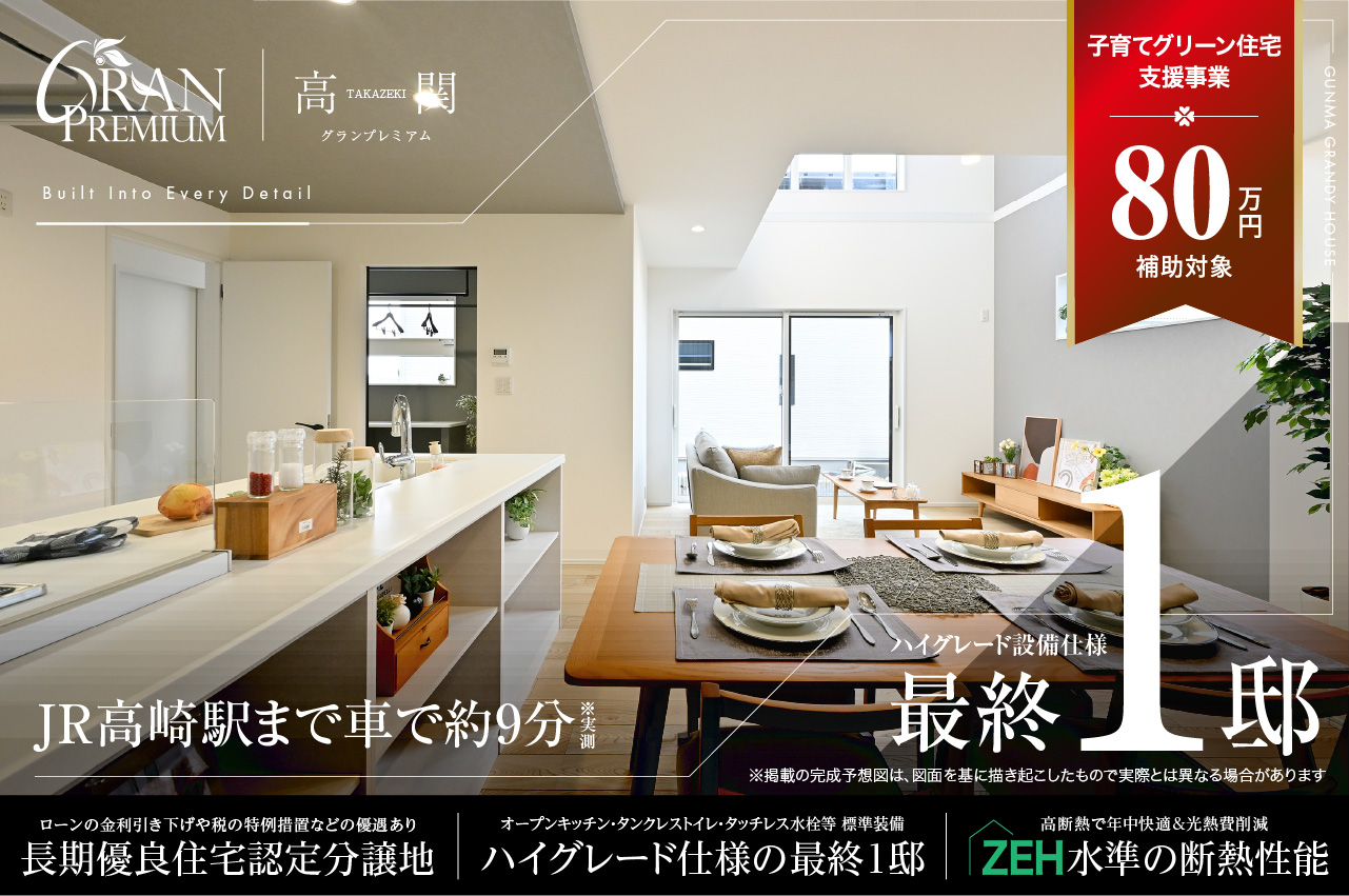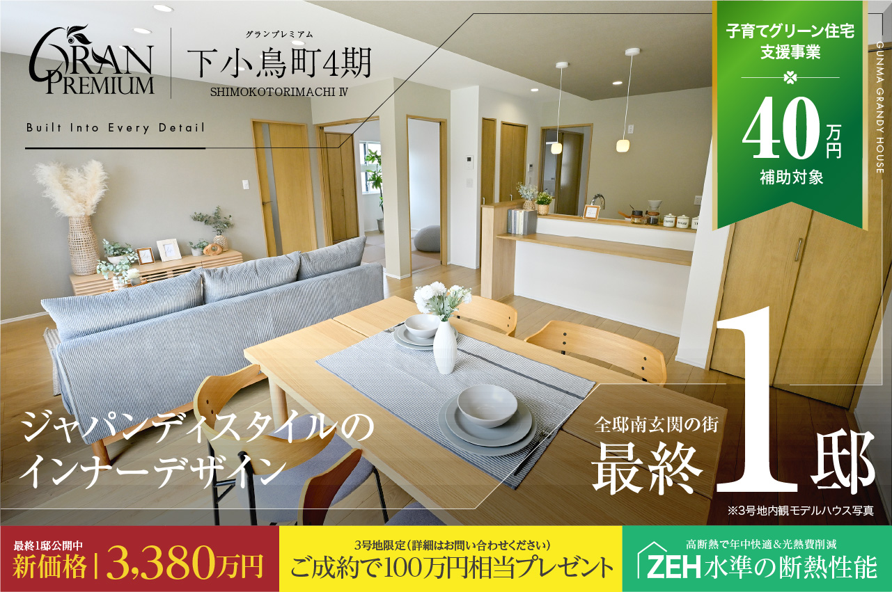 子育てグリーン住宅支援事業|群馬エリア 14件の分譲地、46件のプランが見つかりました。 ※条件付き交付申請物件は、完了検査から1年以内(新築)の契約物件が対象となります。※完了検査から1年以内に売買契約を締結し、完了報告期限(2026.6月末)までに新築住宅の引渡し・入居(謄本取得)を完了させること。※上記の情報は2026年2月現在のものです。※その他詳細につきましては、当社スタッフにお尋ねください。 エリア絞込: すべて 前橋市 高崎市 伊勢崎市 太田市 北群馬郡吉岡町 すべての物件にチェックを入れる すべてチェック 物件をくらべる まとめて資料請求する 0件の分譲地 物件をくらべる(5件まで) まとめて資料請求する(5件まで) 新着 モデルハウス 高崎市 下之城町 セントラルグランドシティ下之城 お気に入り登録人数3人 販売戸数: 16戸 販売価格: 4,080万円 (税込) 〜 ハイグレードモデルハウス3邸公開中 先着3組様限定|ご成約で 100万円相当プレゼント対象 ◆再開発で新たな街づくりが進む区画整理事業地 来場予約 資料請求(無料) 電話相談 お問い合わせ 群馬グランディハウス 高崎本社 高崎市江木町302番地5 0120793311(発信する) 閉じる 分譲地詳細を見る 高崎市 菅谷町 ソレイユグランデ菅谷町10期 お気に入り登録人数人 販売戸数: 2戸 販売価格: 3,480万円 (税込) 長期優良住宅×全邸吹抜天井プラン 建物面積最大37坪超のゆとり ◆全邸南玄関の街並み ◆最大建物面積37坪超 ◆寄棟屋根採用の重厚なファサードデザイン ◆制震住宅・ZEH水準の断熱・省エネ性能×オール電化の住まい ◆宅配ボックス/玄関ドア電子キー/電動シャッター搭載 来場予約 資料請求(無料) 電話相談 お問い合わせ 群馬グランディハウス 高崎本社 高崎市江木町302番地5 0120793311(発信する) 閉じる 分譲地詳細を見る モデルハウス 高崎市 引間町 ソレイユグランデ引間町 お気に入り登録人数人 販売戸数: 2戸 販売価格: 3,830万円 (税込) イオンモール高崎まで車で約5分 吹抜天井・寛ぎと家事楽の全2邸 ◆イオンモール高崎まで車で約5分 ◆吹抜け天井や広々LDKなど開放感と憩いの時間を嗜むプラン ◆毎日の家事や身支度をスマートに支える動線設計 ◆ZEH水準の断熱・省エネ性能×オール電化の住まい ◆宅配ボックス/玄関ドア電子キー/電動シャッター搭載 来場予約 資料請求(無料) 電話相談 お問い合わせ 群馬グランディハウス 高崎本社 高崎市江木町302番地5 0120793311(発信する) 閉じる 分譲地詳細を見る モデルハウス 高崎市 南大類町 グランプレミアム高関 お気に入り登録人数1人 販売戸数: 1戸 販売価格: 4,090万円 (税込) 最終1邸|ハイグレード設備仕様 高崎環状線・伊勢崎街道そば ◆オープンキッチン、タッチレス水栓、タンクレストイレ・床材ラスティックフェイス標準装備のハイグレード設備仕様 ◆ランドリースペース、ワイドカウンター付き洗面台、独立洗面など機能的な水回り設計 ◆長期優良住宅・ZEH水準の断熱・省エネ性能×オール電化の住まい ◆宅配ボックス/玄関ドア電子キー/電動シャッター搭載 来場予約 資料請求(無料) 電話相談 お問い合わせ 群馬グランディハウス 高崎本社 高崎市江木町302番地5 0120793311(発信する) 閉じる 分譲地詳細を見る 価格改定 モデルハウス 高崎市 小八木町 クルールヴィル井野駅西2期 お気に入り登録人数3人 販売戸数: 1戸 販売価格: 3,498万円 (税込) 最終1邸|価格改定物件公開中 ご成約で100万円相当プレゼント ◆保育園・認定こども園約850m圏内 ◆機能性や寛ぎなど様々なシーンを叶える多種多様なプランニング ◆ZEH水準の断熱・省エネ性能×オール電化の住まい ◆宅配ボックス/玄関ドア電子キー/電動シャッター搭載 来場予約 資料請求(無料) 電話相談 お問い合わせ 群馬グランディハウス 高崎本社 高崎市江木町302番地5 0120793311(発信する) 閉じる 分譲地詳細を見る 価格改定 モデルハウス 高崎市 下小鳥町 グランプレミアム下小鳥町4期 お気に入り登録人数人 販売戸数: 1戸 販売価格: 3,380万円 (税込) 最終1邸|新価格公開中 ご成約で100万円相当プレゼント ◆保育園・幼稚園・小学校まで1km圏内 ◆全邸南面玄関、明るさと開放感の全3邸 ◆高崎環状線・国道17号線そばの好立地 ◆ZEH水準の断熱・省エネ性能×オール電化の住まい ◆タッチレス水栓/宅配ボックス/玄関ドア電子キー/電動シャッター搭載 来場予約 資料請求(無料) 電話相談 お問い合わせ 群馬グランディハウス 高崎本社 高崎市江木町302番地5 0120793311(発信する) 閉じる 分譲地詳細を見る モデルハウス 前橋市 青柳町 グランドステージ青柳町5期 お気に入り登録人数2人 販売戸数: 2戸 販売価格: 3,290万円 (税込) 最終2邸 全邸南玄関の街並み ◆全邸南玄関の明るさと開放感 ◆ベルク310m、カインズ440m、普段使いの商業施設が徒歩圏内 ◆水回り一直線のレイアウトや適材適所の収納などの時短動線設計 ◆ZEH水準の断熱・省エネルギー性能×オール電化の住まい ◆玄関ドア電子錠/電動シャッター搭載 来場予約 資料請求(無料) 電話相談 お問い合わせ 群馬グランディハウス 伊勢