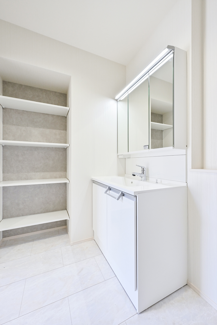 900mm幅の洗面化粧台なので広く使え、毎日の作業もグンと楽になります。ゆとりの収納力でサニタリールームをすっきりと演出します。