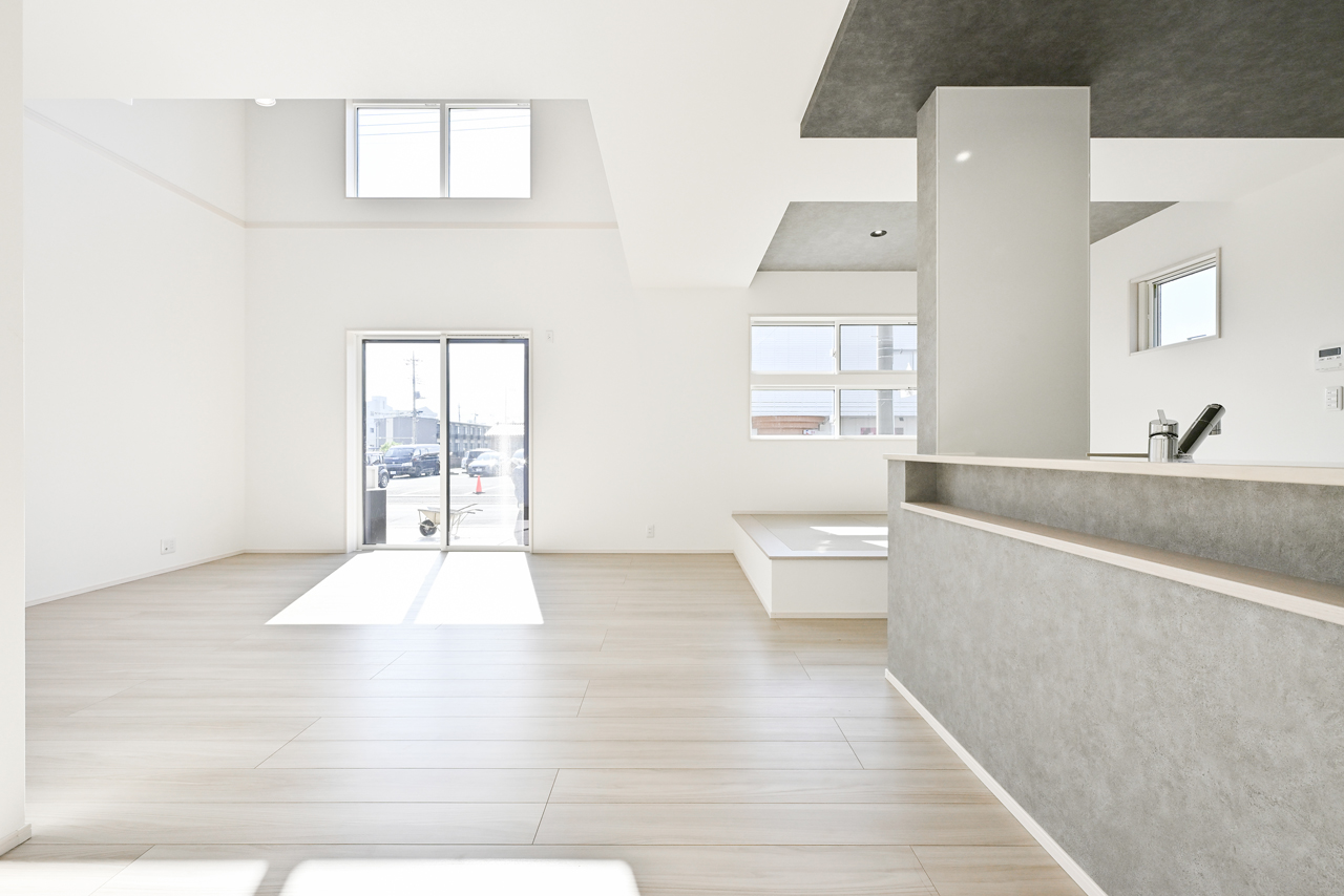 ご家族の団らんや寛ぎの中心となるリビング空間をさらに際立たせる吹抜け天井プラン。2階天井まで続くその圧倒的な存在感と広がりが訪れた方を驚きを持ってお迎えします。大切にしたいご家族やゲストをもてなす上質な空間です。