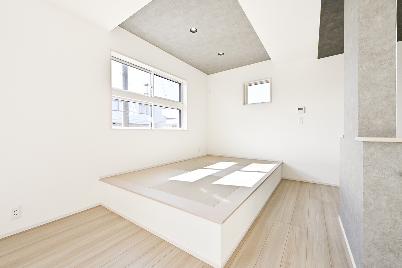 LDKと緩やかに繋がるタタミコーナー。柔らかい畳の上でお昼寝したり、子どもと寝そべって本を読み聞かせしたり、時にはお座敷スタイルで一味違うディナーを楽しんだり。ちょっと贅沢な時間を楽しめる個性的な和モダン空間です。