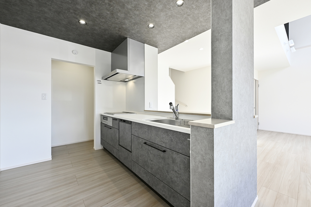家族でのコミュニケーションがとれる対面型システムキッチン。横一列にシンクとコンロをまとめたシンプルな形です。動きやすさとスタイリッシュなデザインが魅力。