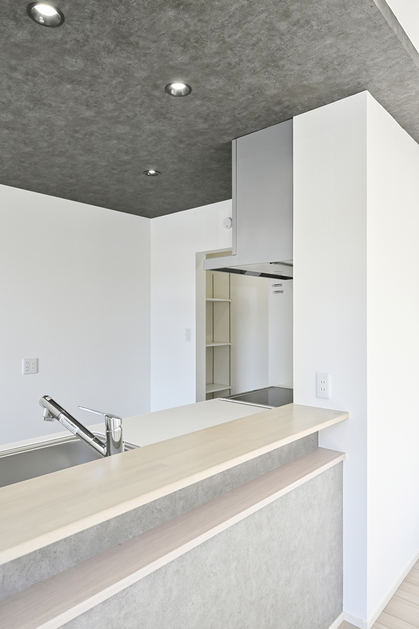 システムキッチンのすぐそばに配置したパントリー。ストック食品や調味料やお酒のほか、非常食や水のペットボトルなどの防災用品も収納できます。キッチンからすぐ手が届く場所にあるから、整理整頓もテキパキできて、キッチン空間をスッキリ保てます。
