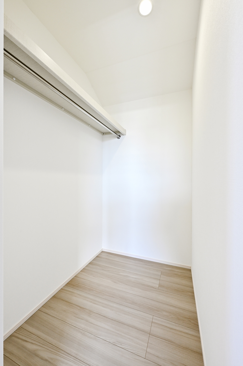 ご夫婦や子ども達の衣類をたっぷりしまえる大容量のウォークインクローゼット。季節の衣類から鞄や帽子などの小物までたっぷり保管可能。ウォークインタイプなので衣類の出し入れや整理整頓もスムーズに行えます。