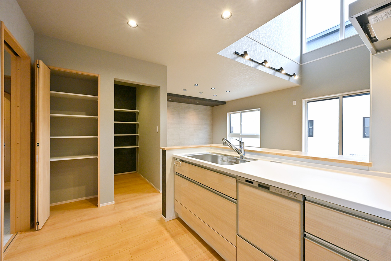 リビングそばに、家族がみんなが使いやすいたっぷり収納できるストレージをご用意。日用品や生活雑貨はもちろん、お子様のおもちゃなど、様々な収納に活用できます。日常の収納以外にも、来客時には、散らかった雑誌やおもちゃなども手早く片づける事ができます。