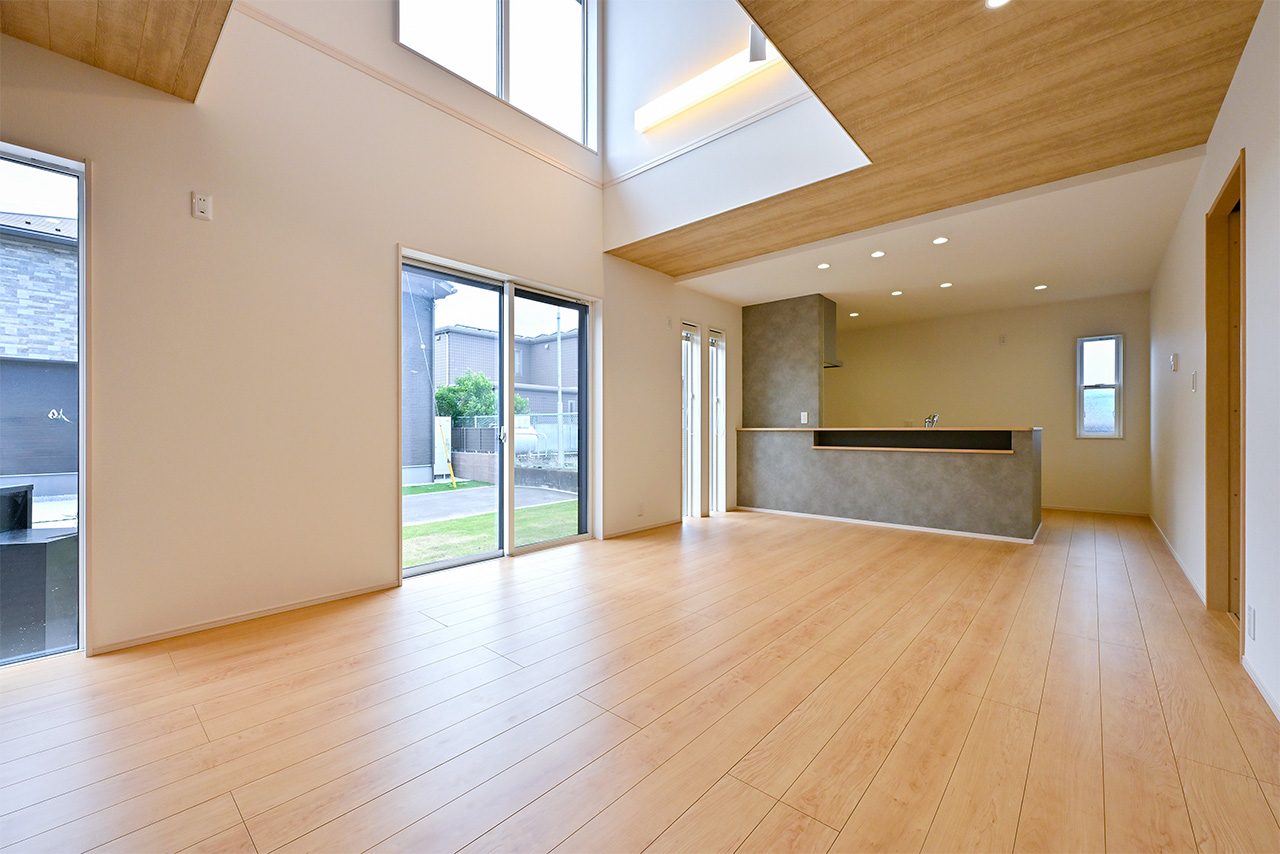 リビングという暮らしのメインスペースは、一日で家族が一番長く過ごす場所。その居心地をさらに高めるために18帖以上のワイドな広さを確保しました。広場のようなパブリックスペースがご家族の集いや団らんを心地よく育みます。