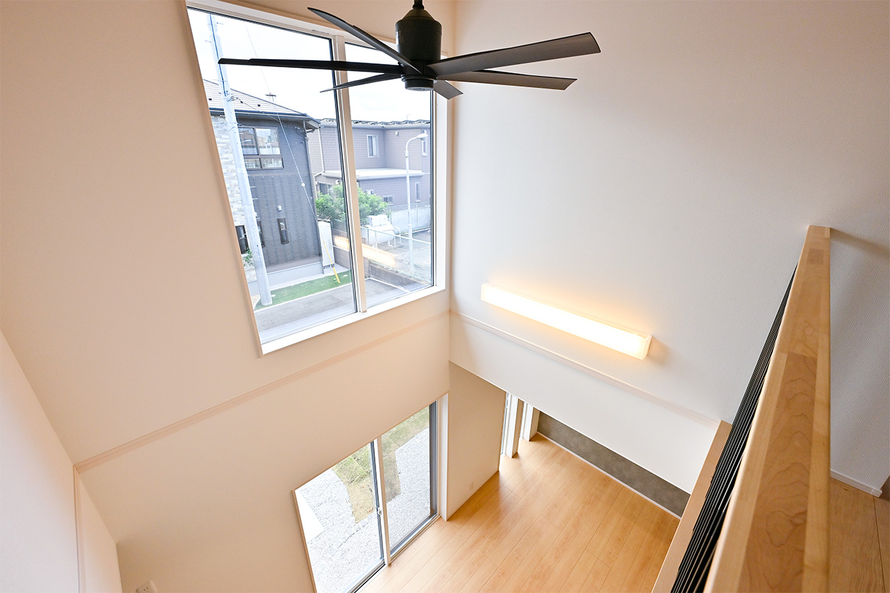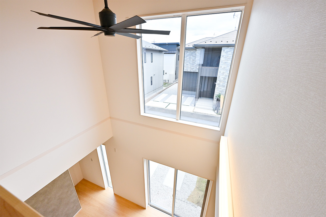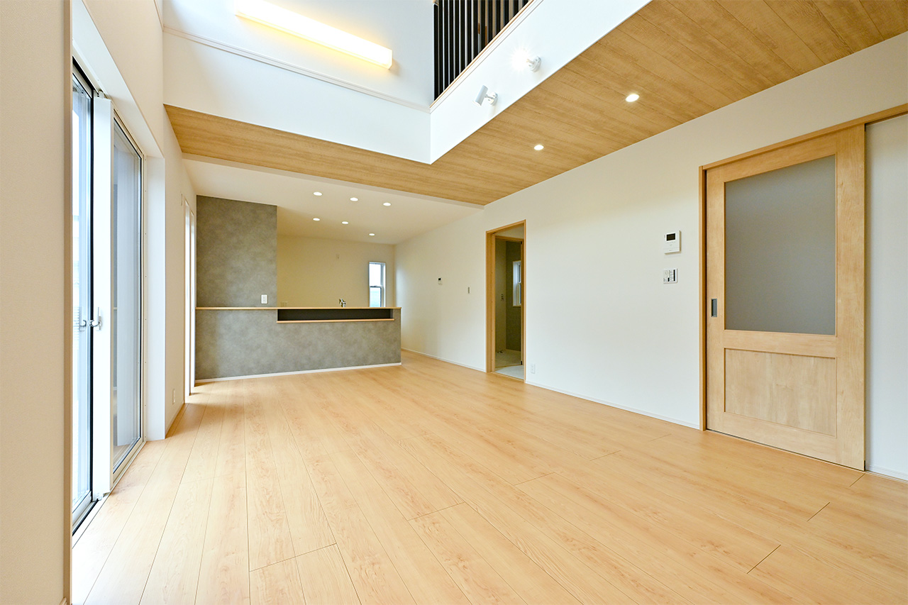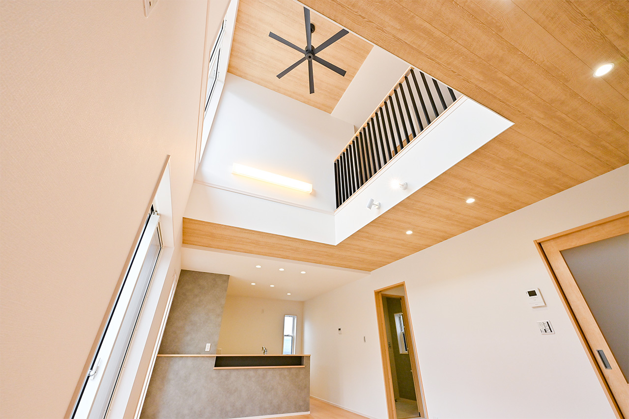 ご家族の団らんや寛ぎの中心となるリビング空間をさらに際立たせる吹抜け天井プラン。2階天井まで続くその圧倒的な存在感と広がりが訪れた方を驚きを持ってお迎えします。大切にしたいご家族やゲストをもてなす上質な空間です。