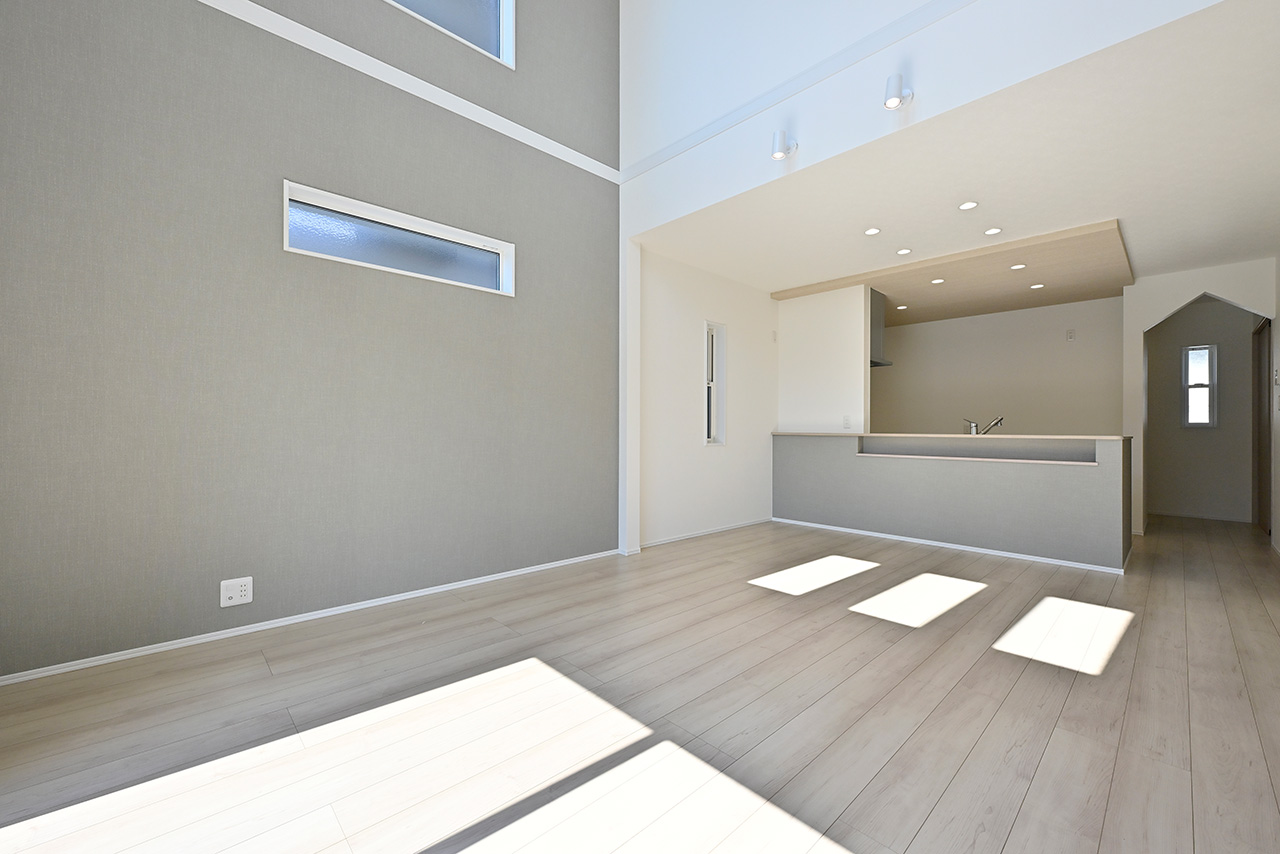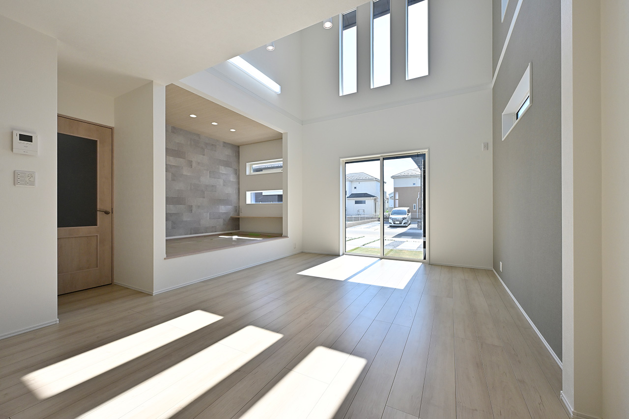 ご家族の団らんや寛ぎの中心となるリビング空間をさらに際立たせる吹抜け天井プラン。2階天井まで続くその圧倒的な存在感と広がりが訪れた方を驚きを持ってお迎えします。大切にしたいご家族やゲストをもてなす上質な空間です。