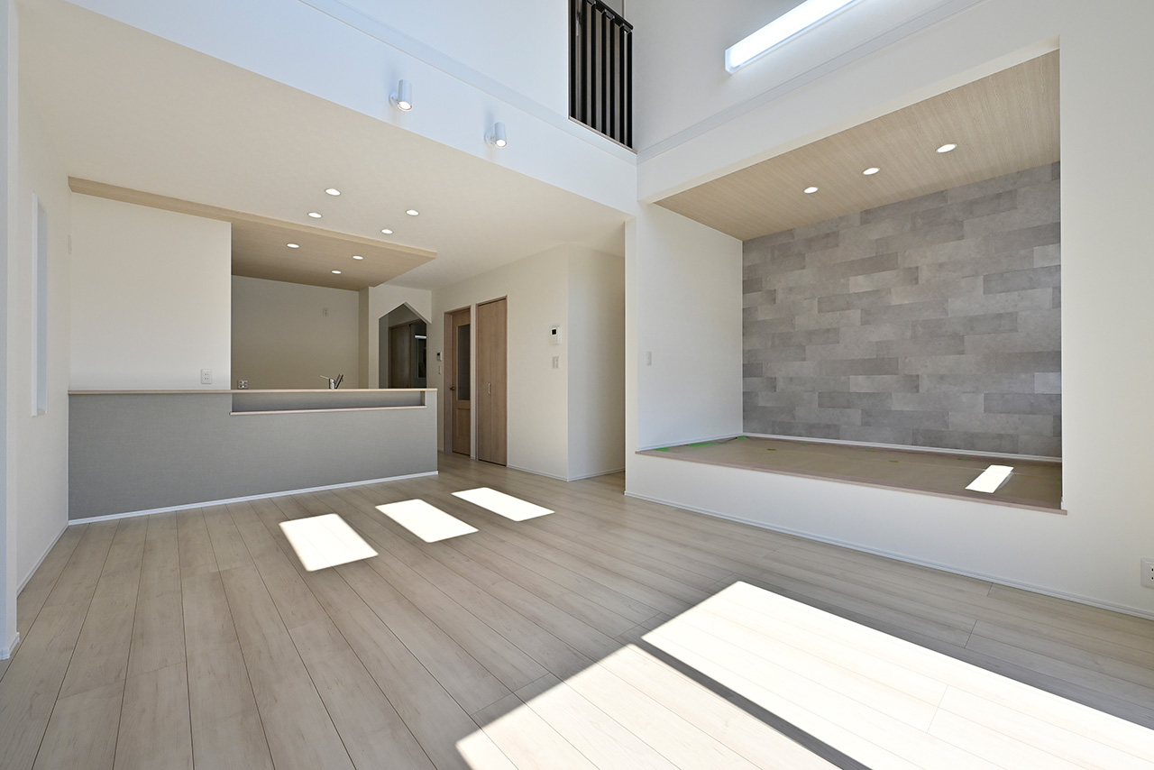 LDKと緩やかに繋がるタタミコーナー。柔らかい畳の上でお昼寝したり、子どもと寝そべって本を読み聞かせしたり、時にはお座敷スタイルで一味違うディナーを楽しんだり。ちょっと贅沢な時間を楽しめる個性的な和モダン空間です。