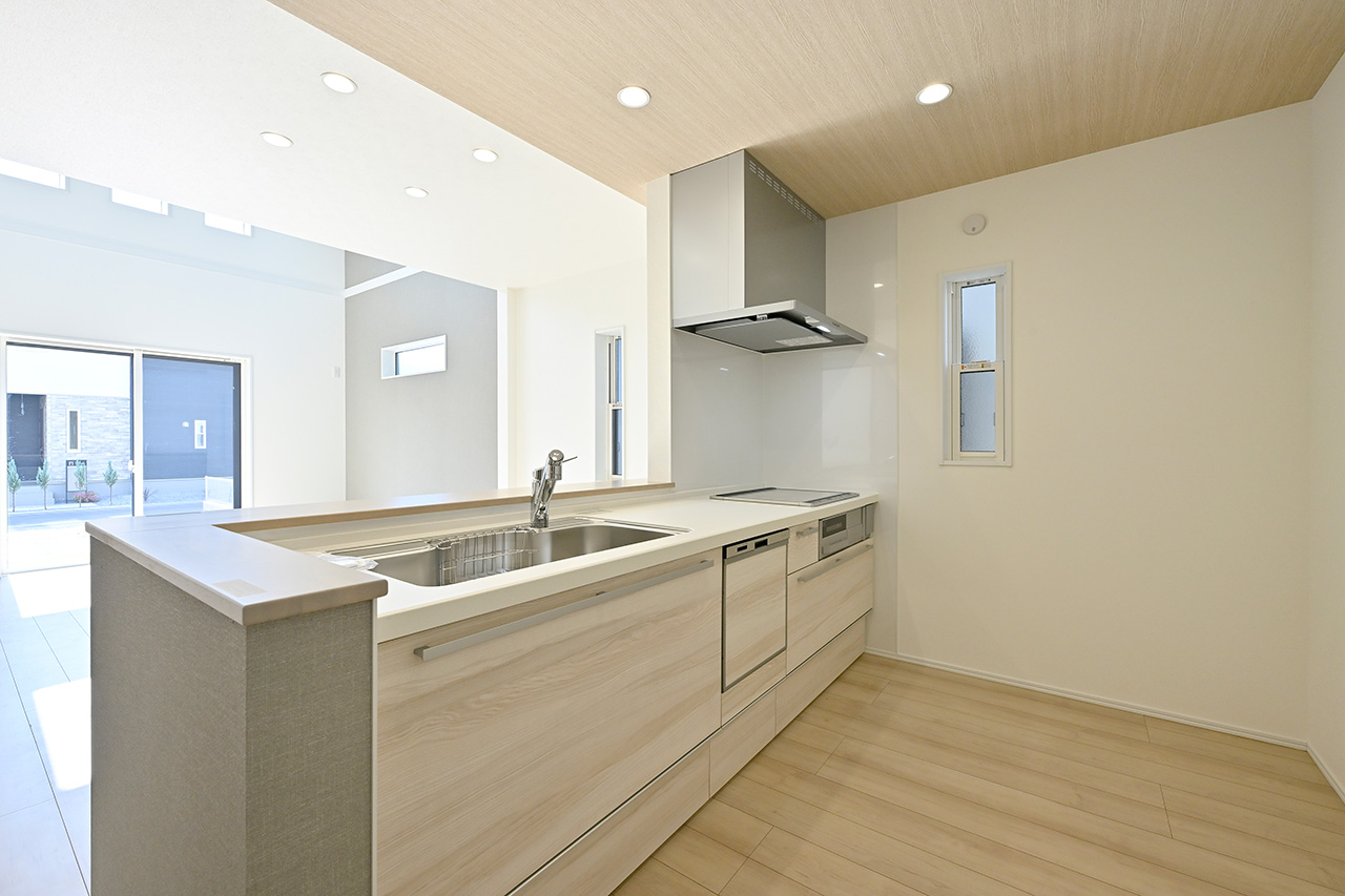家族でのコミュニケーションがとれる対面型システムキッチンです。横一列にシンクとコンロをまとめたシンプルな形です。動きやすさとスタイリッシュなデザインが魅力です。