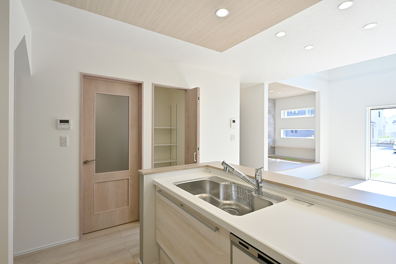 システムキッチンのすぐそばに配置したパントリー。ストック食品や調味料やお酒のほか、非常食や水のペットボトルなどの防災用品も収納できます。キッチンからすぐ手が届く場所にあるから、整理整頓もテキパキできて、キッチン空間をスッキリ保てます。