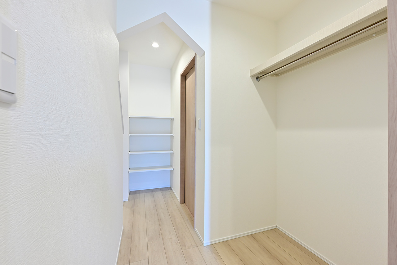 1階・2階のホールやリビングのそばに、用途やライフスタイルに合わせて自由にお使いいただける大容量の収納スペースをご用意しました。季節の衣類から鞄などの小物まで、たっぷりまとめて収納できます。