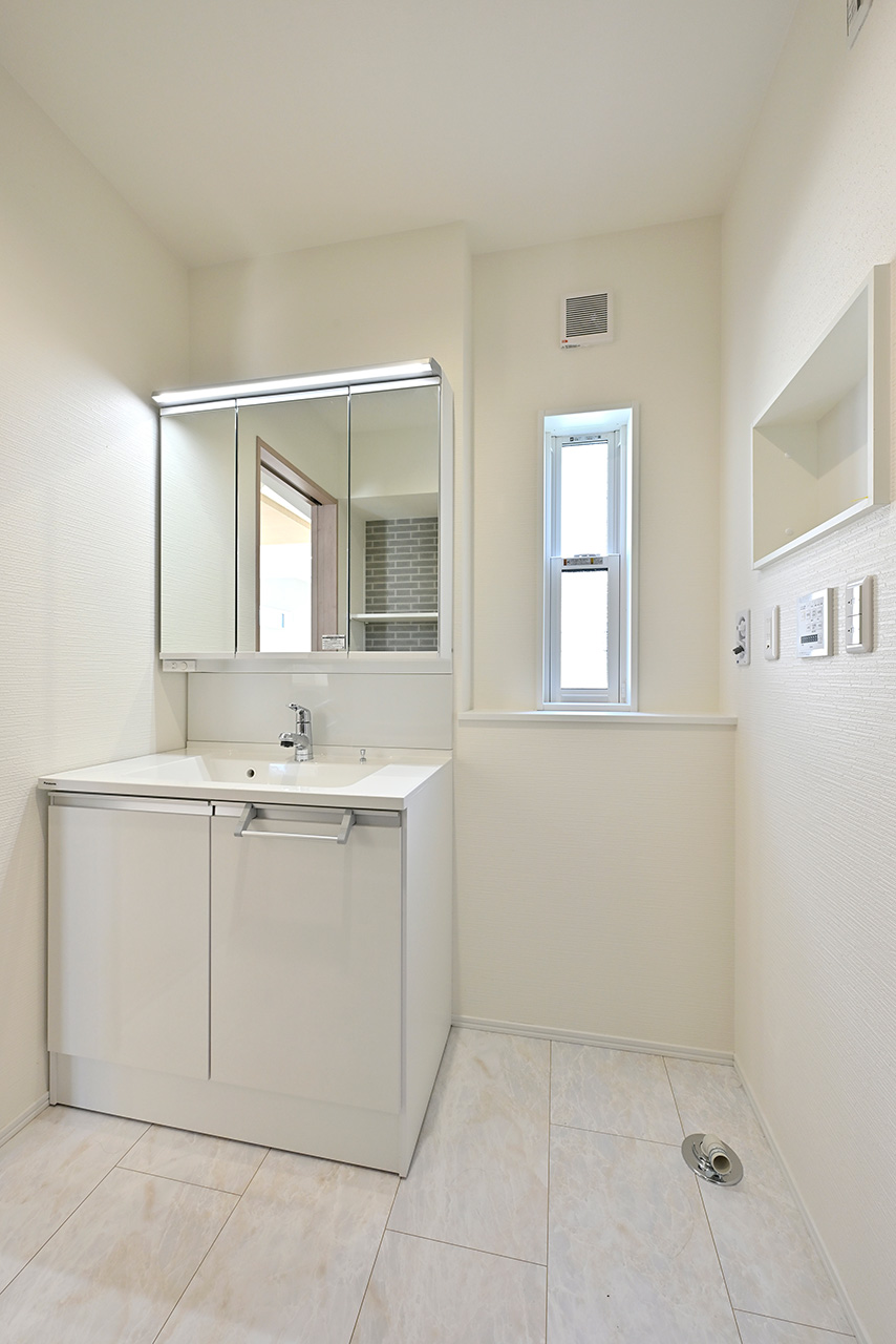 900mm幅の洗面化粧台なので広く使え、毎日の作業もグンと楽になります。ゆとりの収納力でサニタリールームをすっきりと演出します。