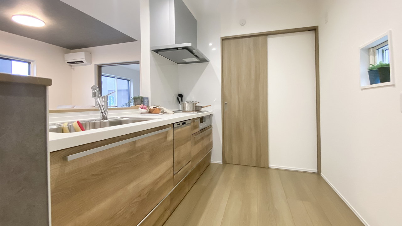 家族でのコミュニケーションがとれる対面型システムキッチンです。横一列にシンクとコンロをまとめたシンプルな形です。動きやすさとスタイリッシュなデザインが魅力です。
