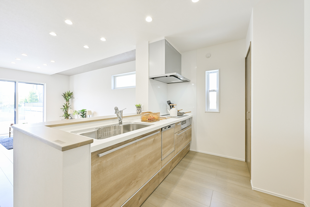 家族でのコミュニケーションがとれる対面型システムキッチンです。横一列にシンクとコンロをまとめたシンプルな形です。動きやすさとスタイリッシュなデザインが魅力です。