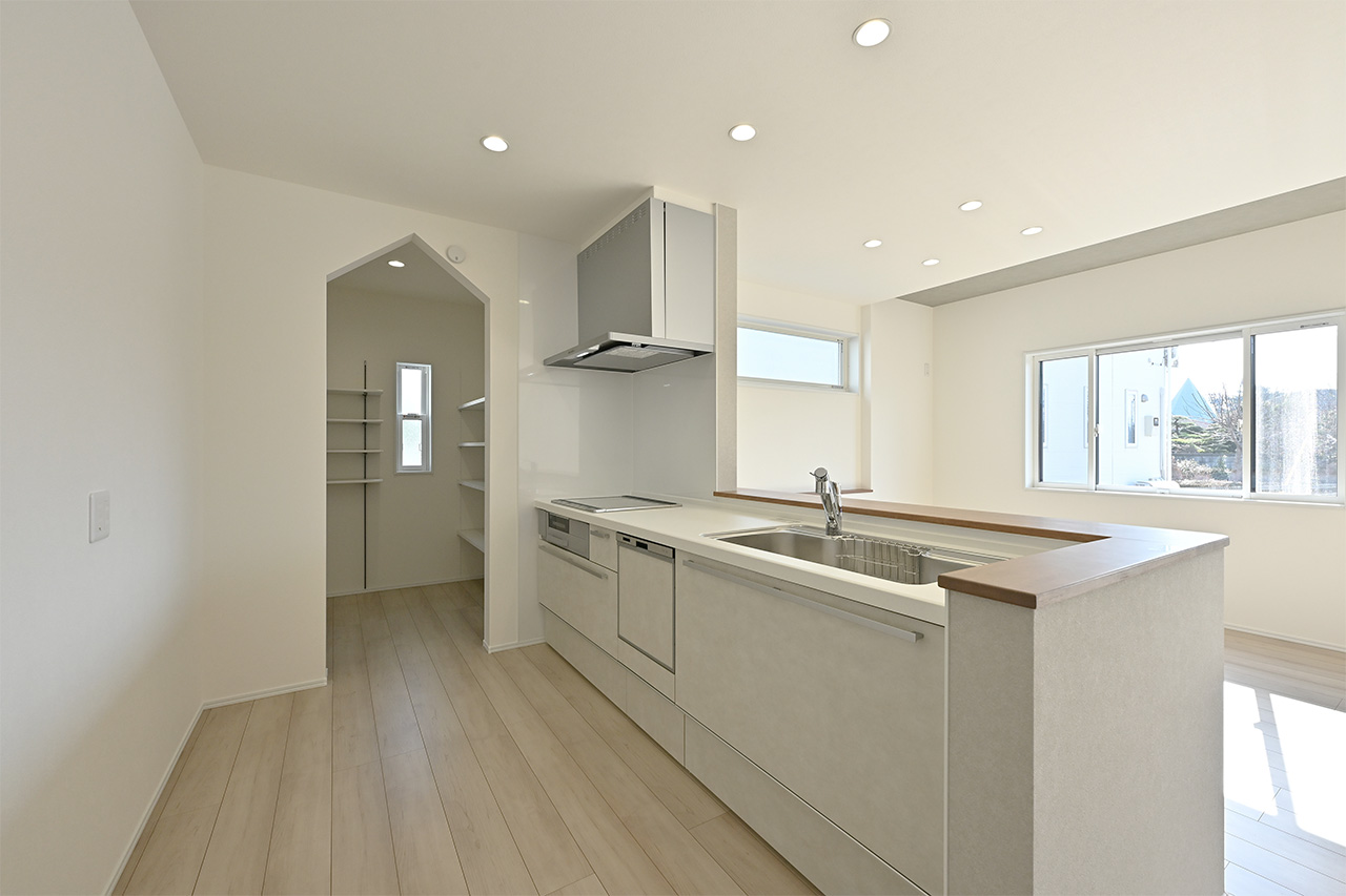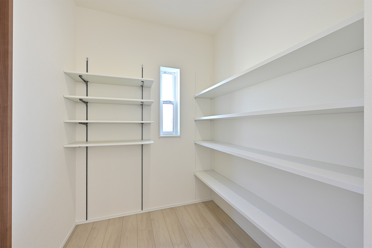 両側から出入りできる2WAY仕様の食品庫。食品や日用品のストックや調理器具の保管に重宝します。
