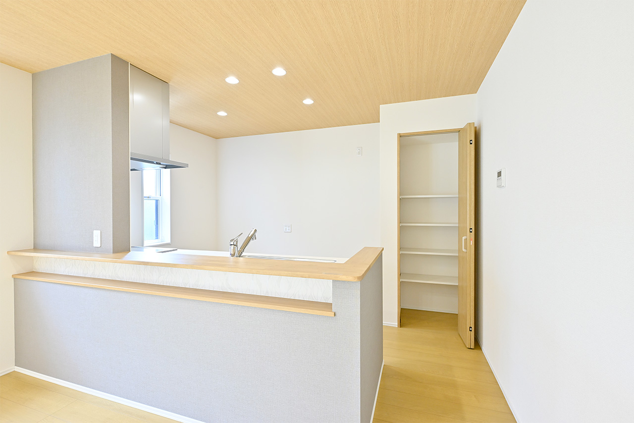 システムキッチンのすぐそばに配置したパントリー。ストック食品や調味料やお酒のほか、非常食や水のペットボトルなどの防災用品も収納できます。キッチンからすぐ手が届く場所にあるから、整理整頓もテキパキできて、キッチン空間をスッキリ保てます。