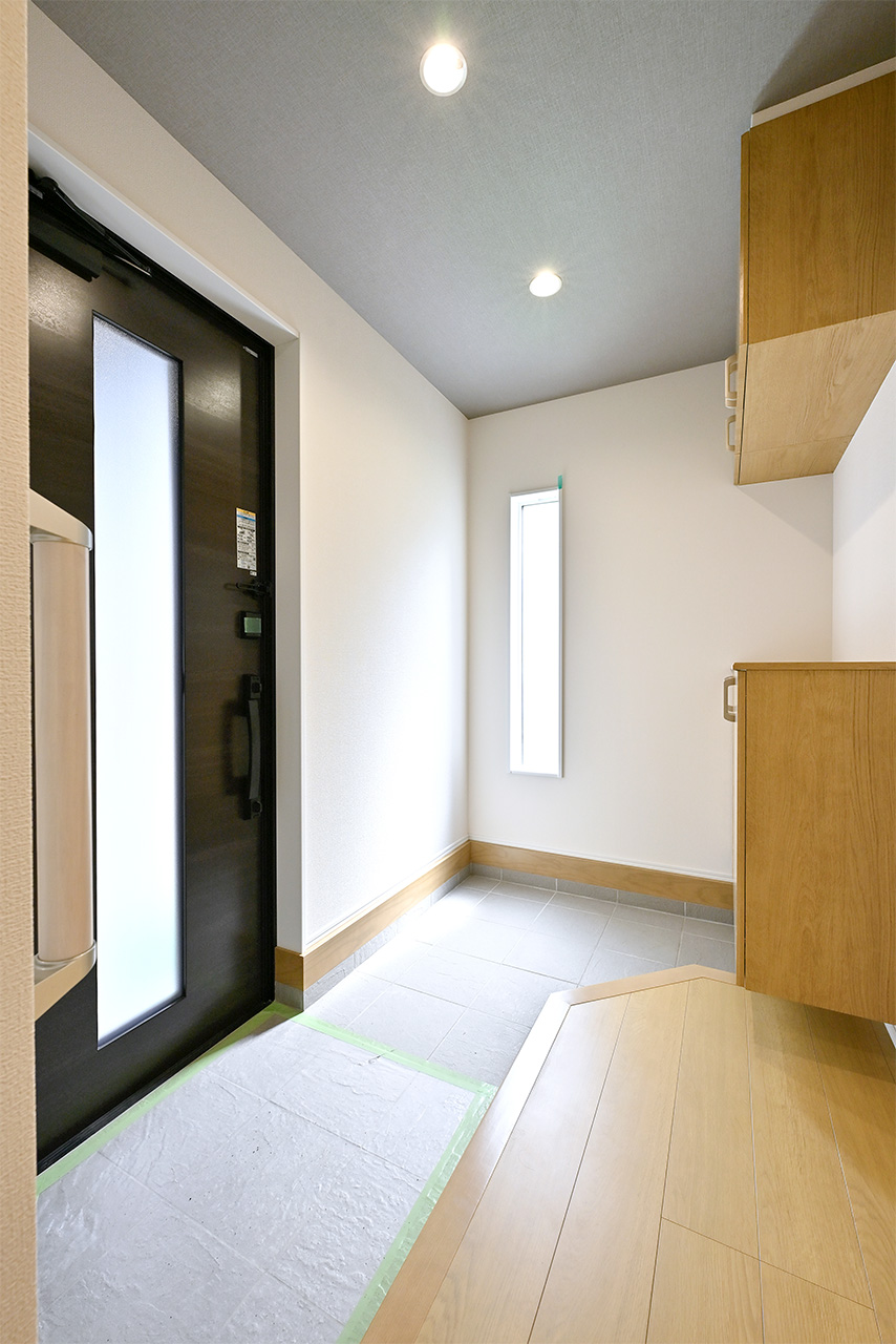 人の動きを感知して自動的に点灯する人感センサー付玄関照明を採用しました。ご家族の帰宅を明るく迎えるだけでなく、不意なライトの光が侵入者への警告になります。