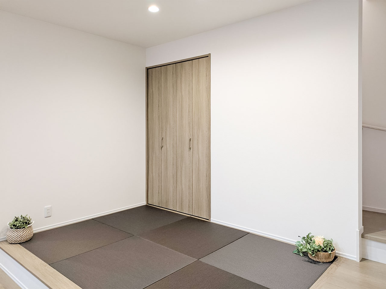 LDKと緩やかに繋がるタタミコーナー。柔らかい畳の上でお昼寝したり、子どもと寝そべって本を読み聞かせしたり、時にはお座敷スタイルで一味違うディナーを楽しんだり。ちょっと贅沢な時間を楽しめる個性的な和モダン空間です。