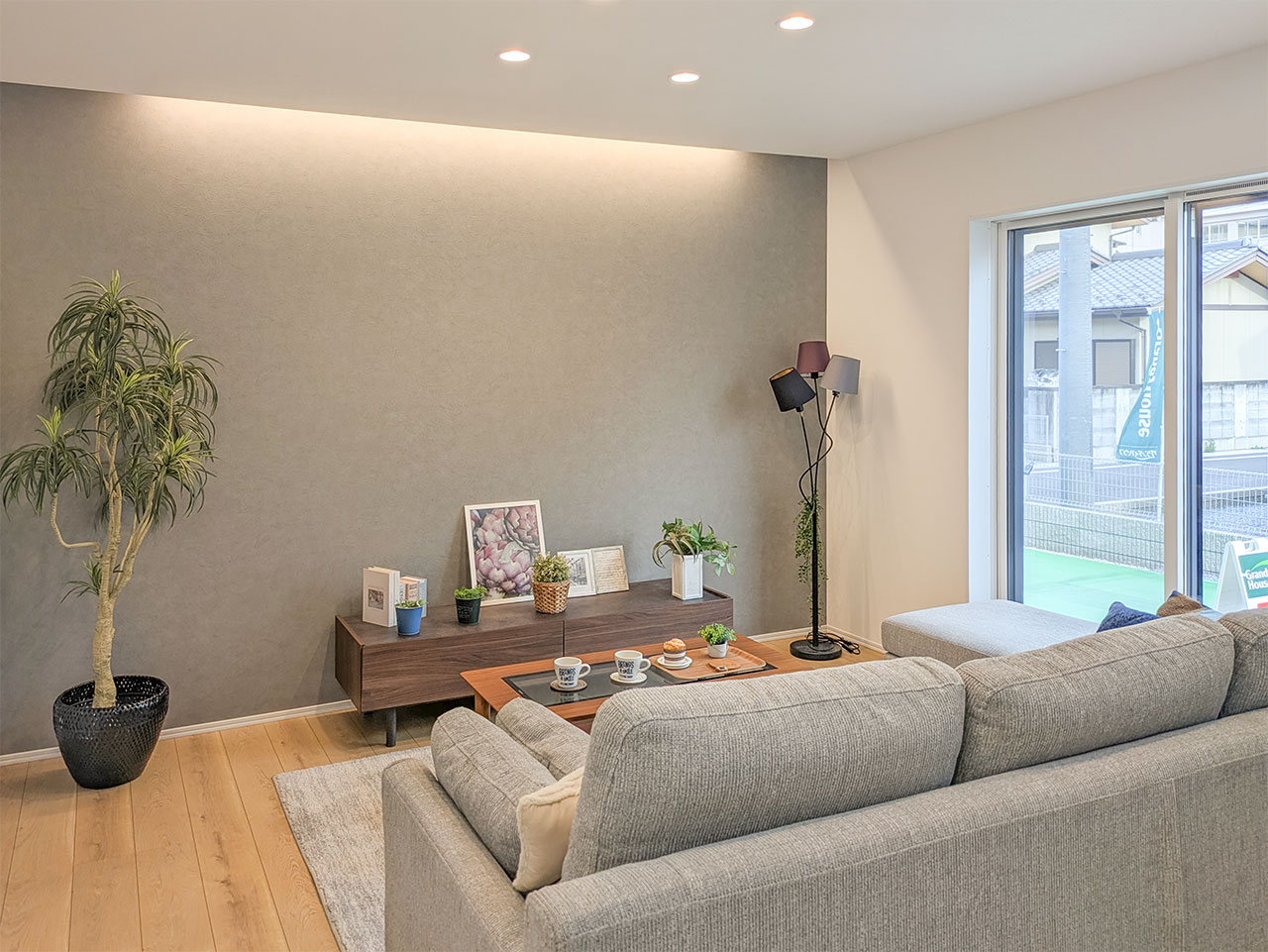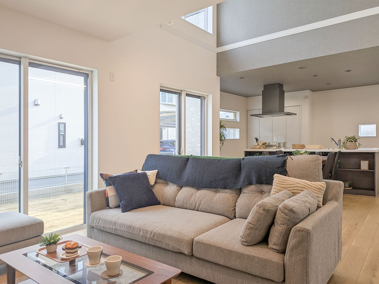 ご家族の団らんや寛ぎの中心となるリビング空間をさらに際立たせる吹抜天井プラン。2階天井まで続くその圧倒的な存在感と広がりが訪れた方を驚きを持ってお迎えします。大切にしたいご家族やゲストをもてなす上質な空間です。