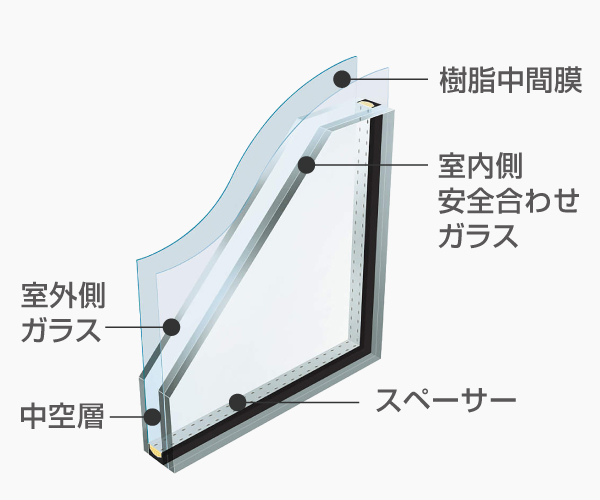 ガラスの間に強度と柔軟性に優れた樹脂中間膜を挟み込んだ、破壊されにくい防犯タイプの複層ガラス。強風時の飛来物対策にも有効です。