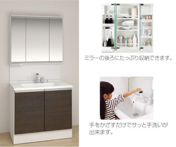 900mm幅の洗面化粧台なので広く使え、毎日の作業もグンと楽になります。ゆとりの収納力でサニタリールームをすっきりと演出します。