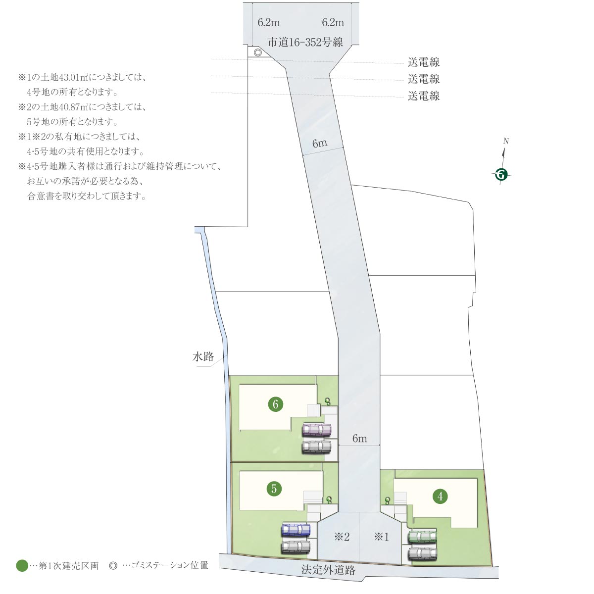 | 備考2 | ※各号地の上空を電線が通過します。 ※掲載の図面は計画段階の図面を基に描き起こしたもので、実際とは異なる場合がございます。また、施工上の理由及び改良のため変更することがございます。 |