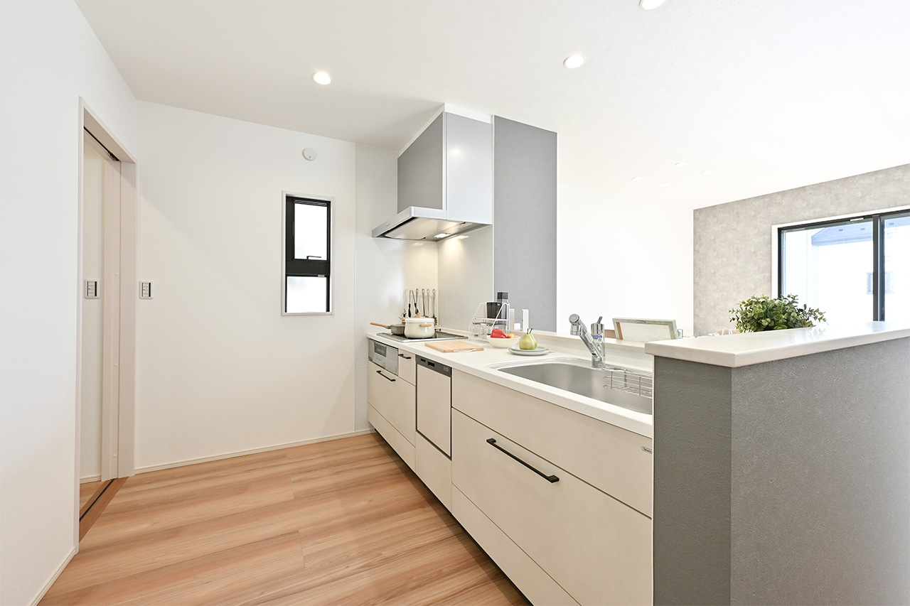 水回り空間にくまなく目が届く、回遊型の動線を採用したシステムキッチン。両サイドからアクセスできる開放的なキッチンは、家族が協力しやすく、家族の食事の時間も楽しくなりそう。親子で一緒に作業する体験を通じて、子供達の健やかな成長をアシストします。