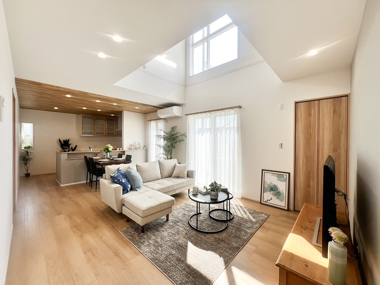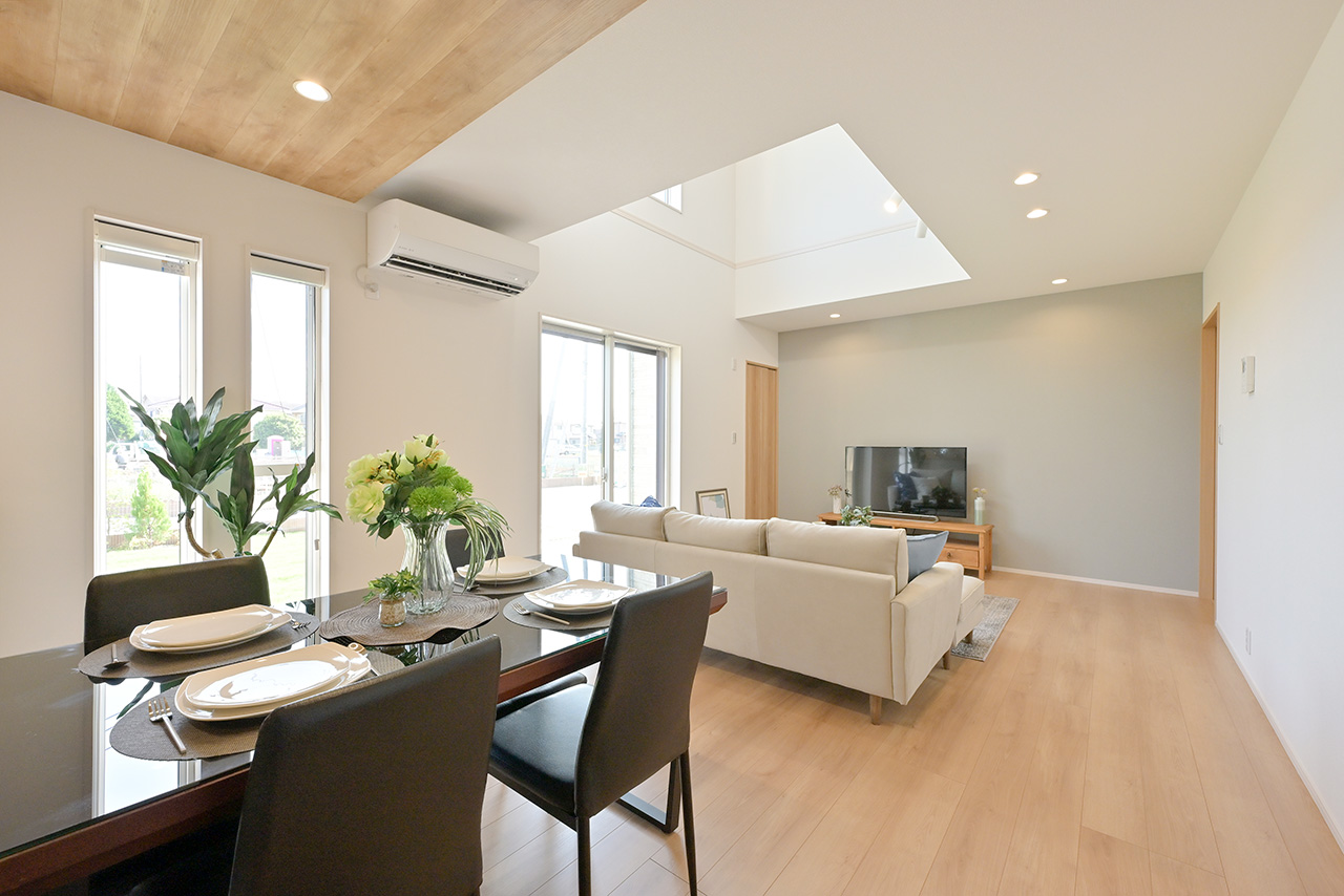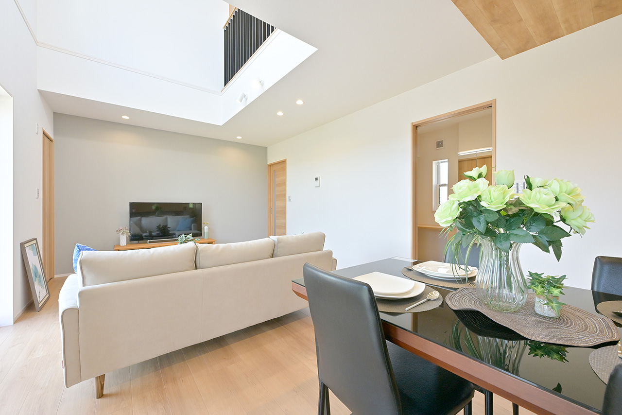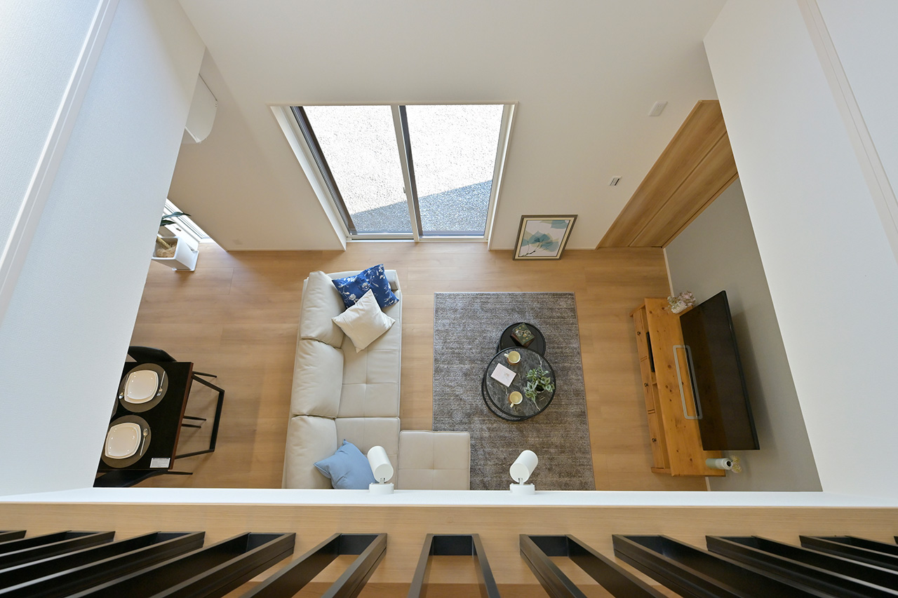 ご家族の団らんや寛ぎの中心となるリビング空間をさらに際立たせる吹抜け天井プラン。2階天井まで続くその圧倒的な存在感と広がりが訪れた方を驚きを持ってお迎えします。大切にしたいご家族やゲストをもてなす上質な空間です。