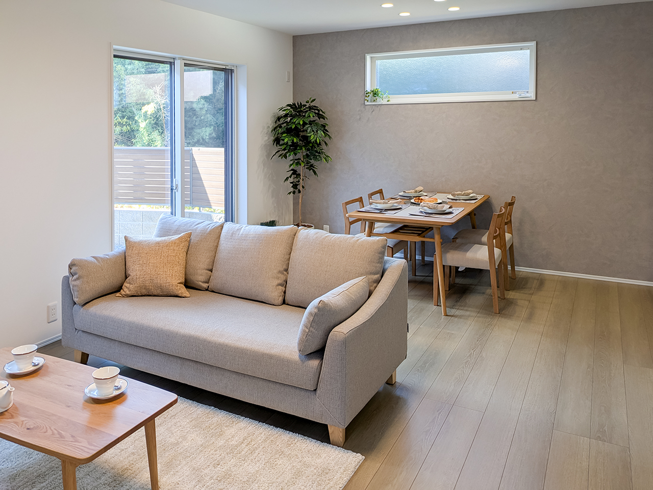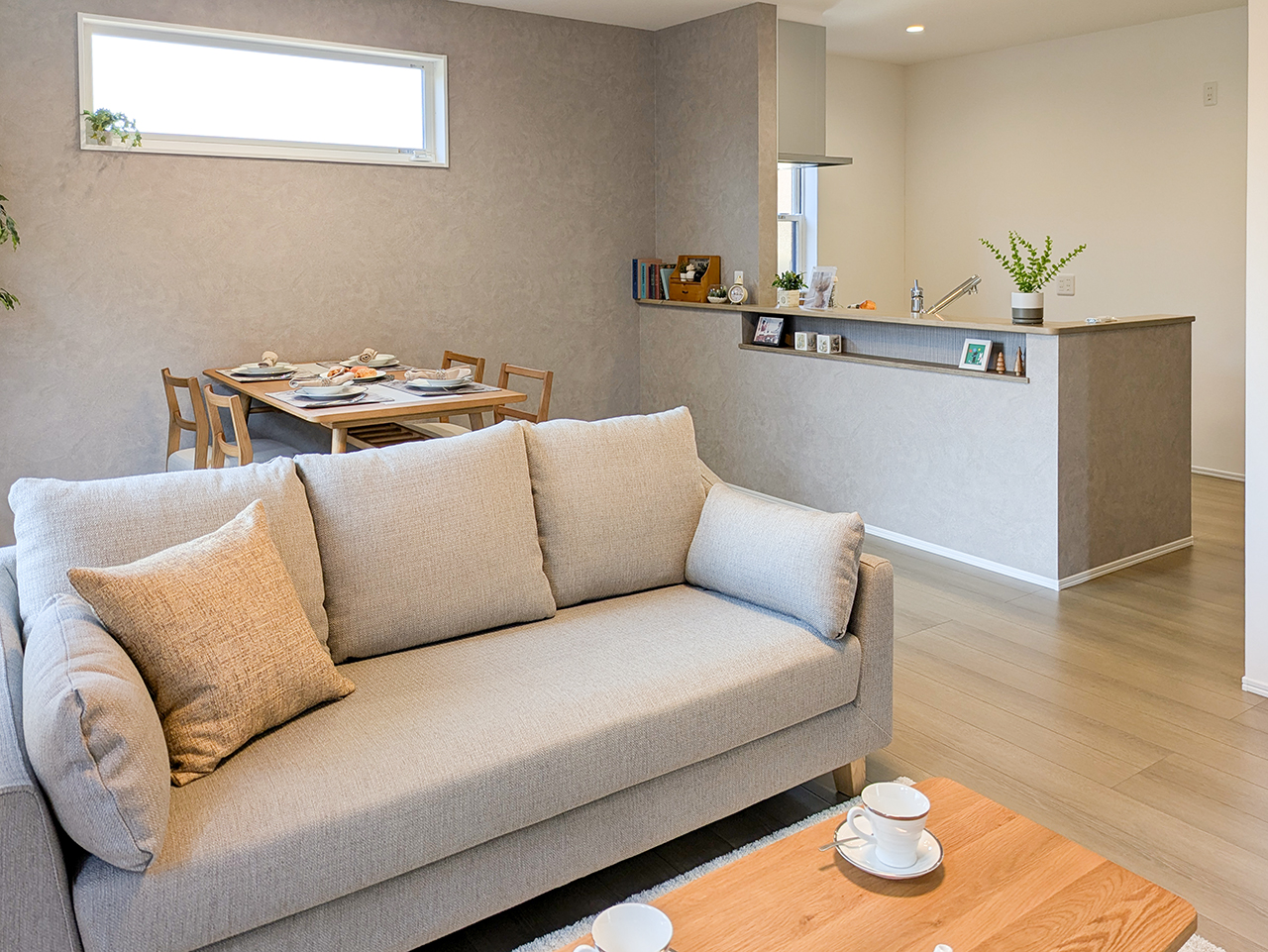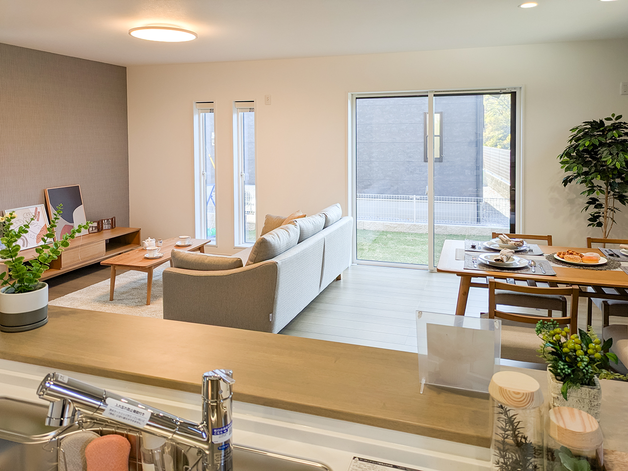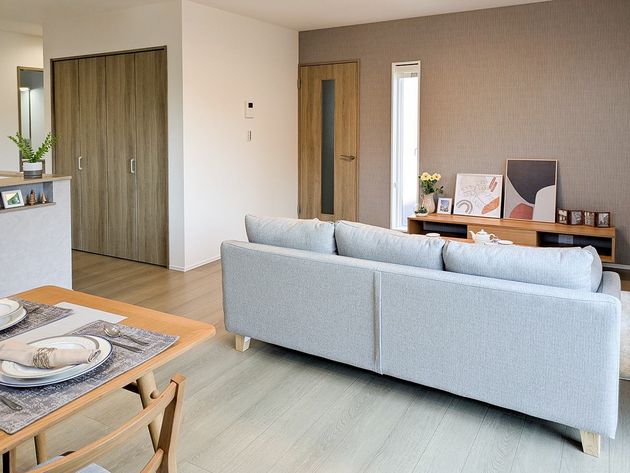 リビングという暮らしのメインスペースは、一日で家族が一番長く過ごす場所。その居心地をさらに高めるために18帖以上のワイドな広さを確保しました。広場のようなパブリックスペースがご家族の集いや団らんを心地よく育みます。