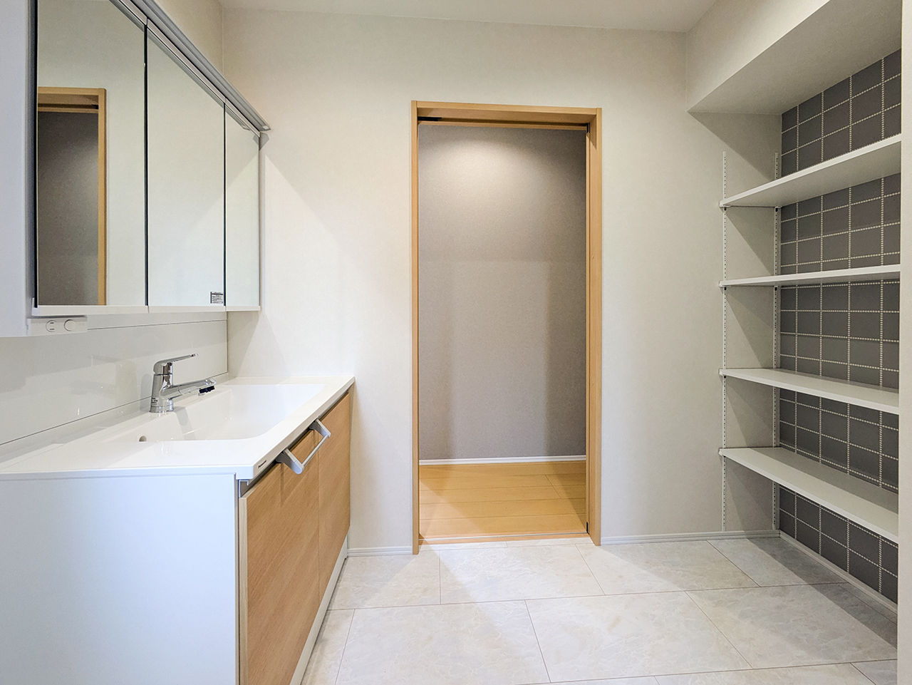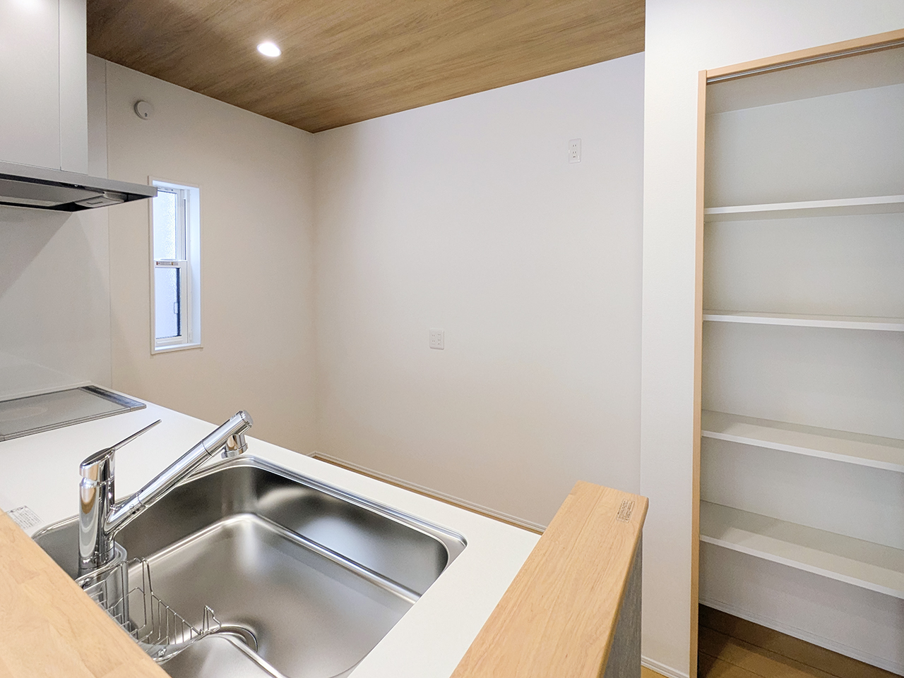 システムキッチンのすぐそばに配置したパントリー。ストック食品や調味料やお酒のほか、非常食や水のペットボトルなどの防災用品も収納できます。キッチンからすぐ手が届く場所にあるから、整理整頓もテキパキできて、キッチン空間をスッキリ保てます。