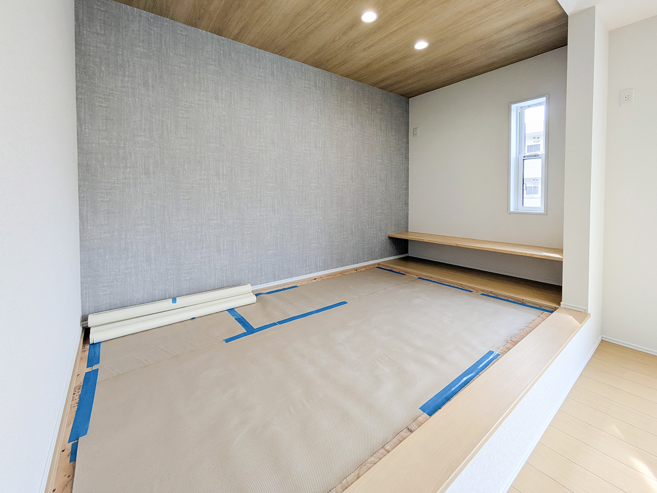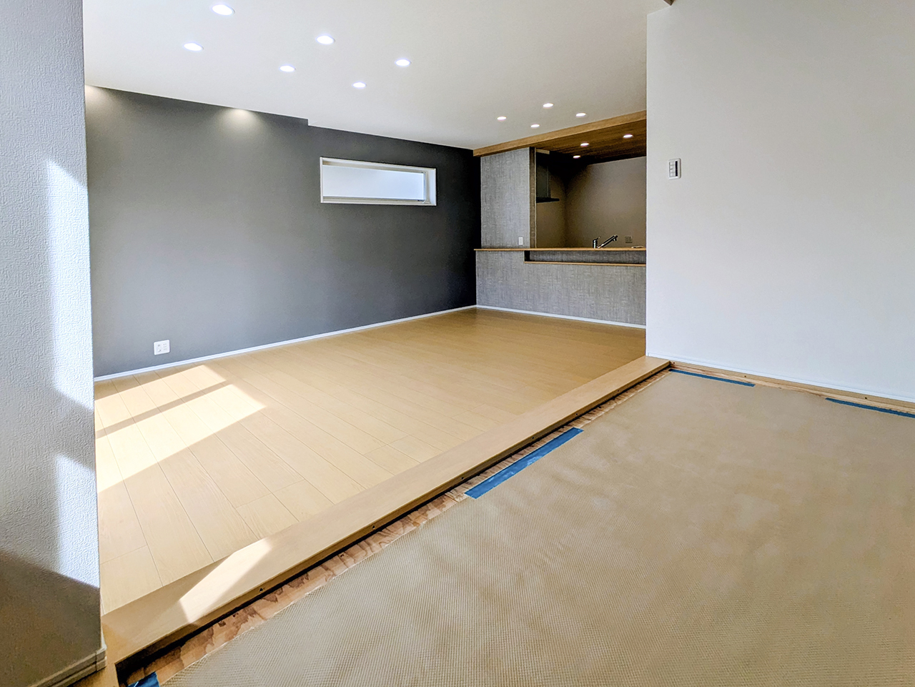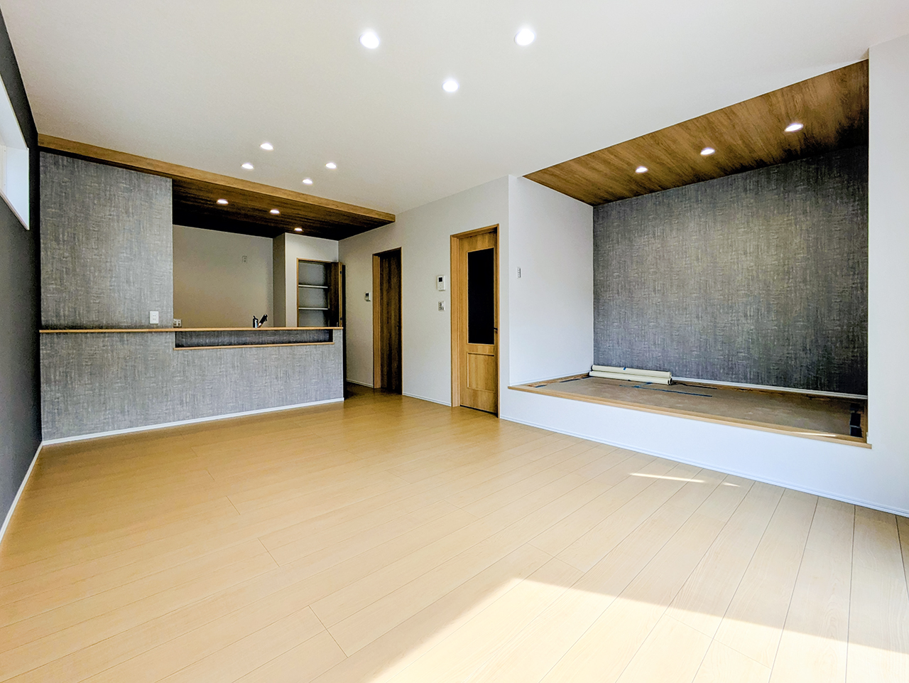 LDKと緩やかに繋がるタタミコーナー。柔らかい畳の上でお昼寝したり、子どもと寝そべって本を読み聞かせしたり、時にはお座敷スタイルで一味違うディナーを楽しんだり。ちょっと贅沢な時間を楽しめる個性的な和モダン空間です。