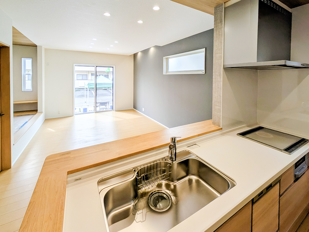 家族でのコミュニケーションがとれる対面型システムキッチンです。横一列にシンクとコンロをまとめたシンプルな形です。動きやすさとスタイリッシュなデザインが魅力です。