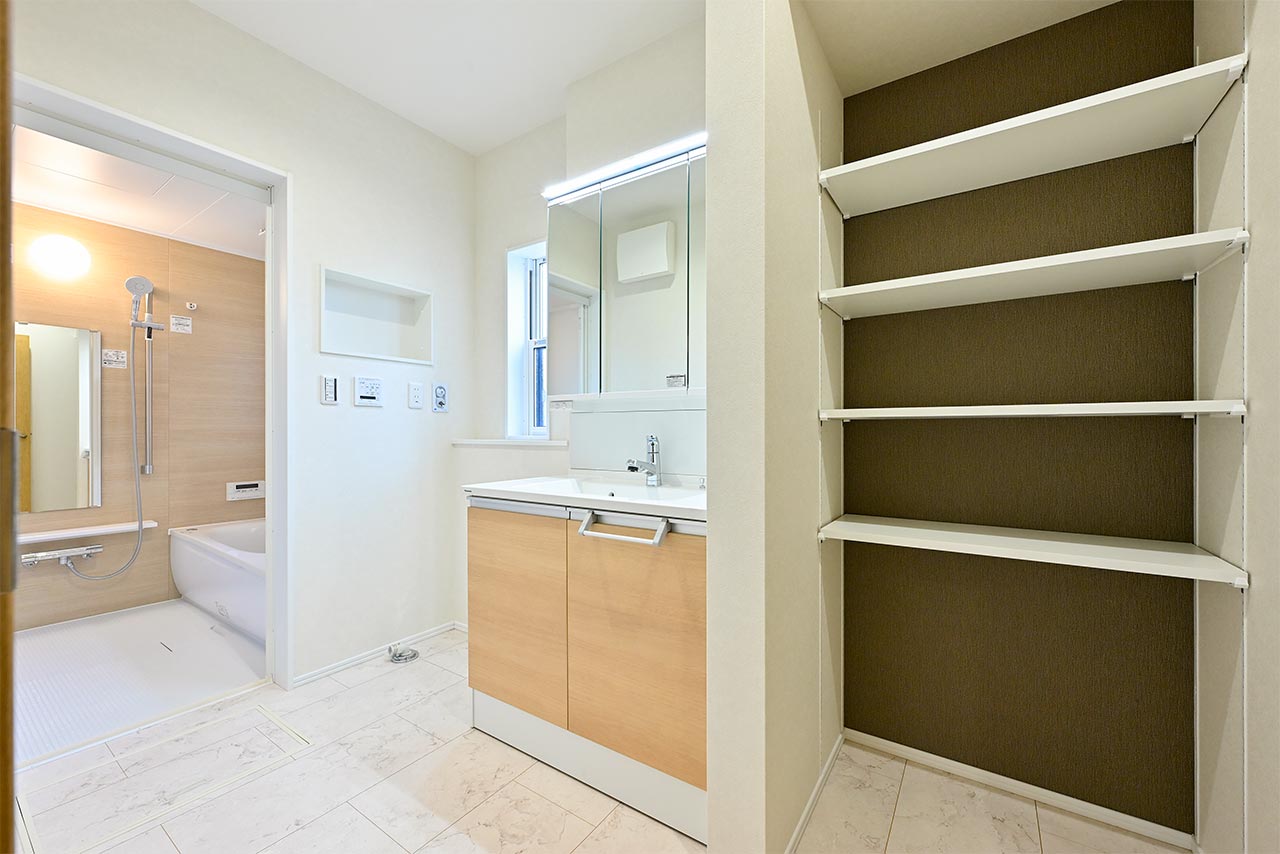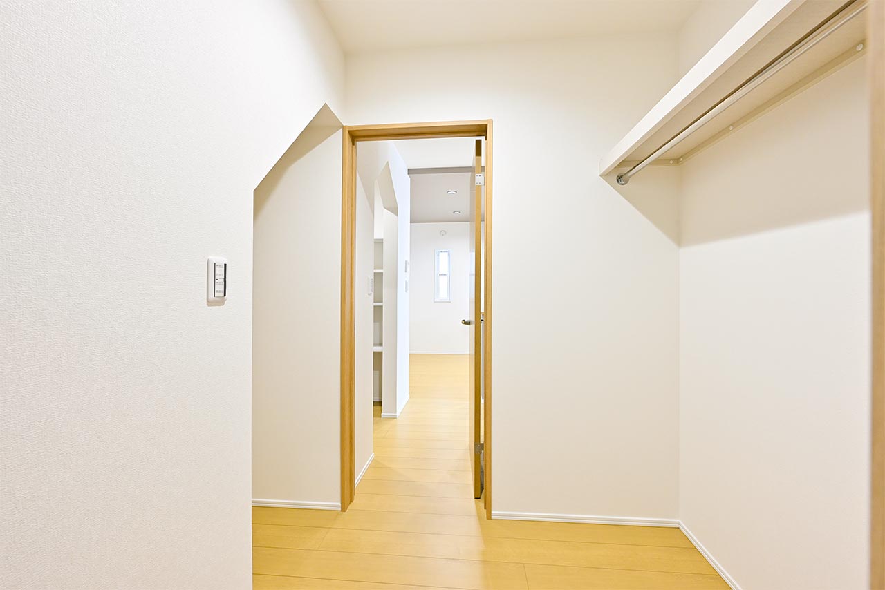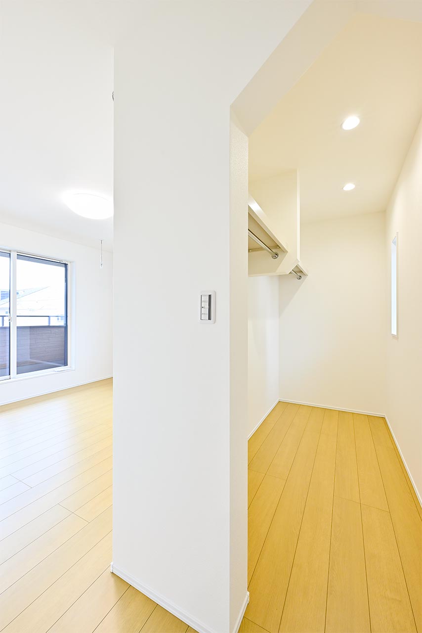 1階・2階のホールやリビングのそばに、用途やライフスタイルに合わせて自由にお使いいただける大容量の収納スペースをご用意しました。季節の衣類から鞄などの小物まで、たっぷりまとめて収納できます。