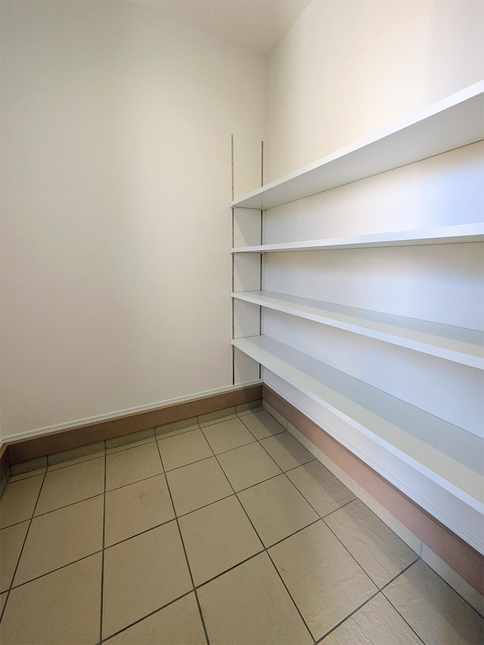 リビングそばに、家族がみんなが使いやすいたっぷり収納できるストレージをご用意。日用品や生活雑貨はもちろん、お子様のおもちゃなど、様々な収納に活用できます。日常の収納以外にも、来客時には、散らかった雑誌やおもちゃなども手早く片づける事ができます。