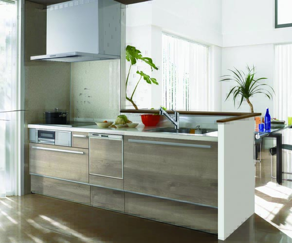 家族でのコミュニケーションがとれる対面型システムキッチンです。横一列にシンクとコンロをまとめたシンプルな形です。動きやすさとスタイリッシュなデザインが魅力です。