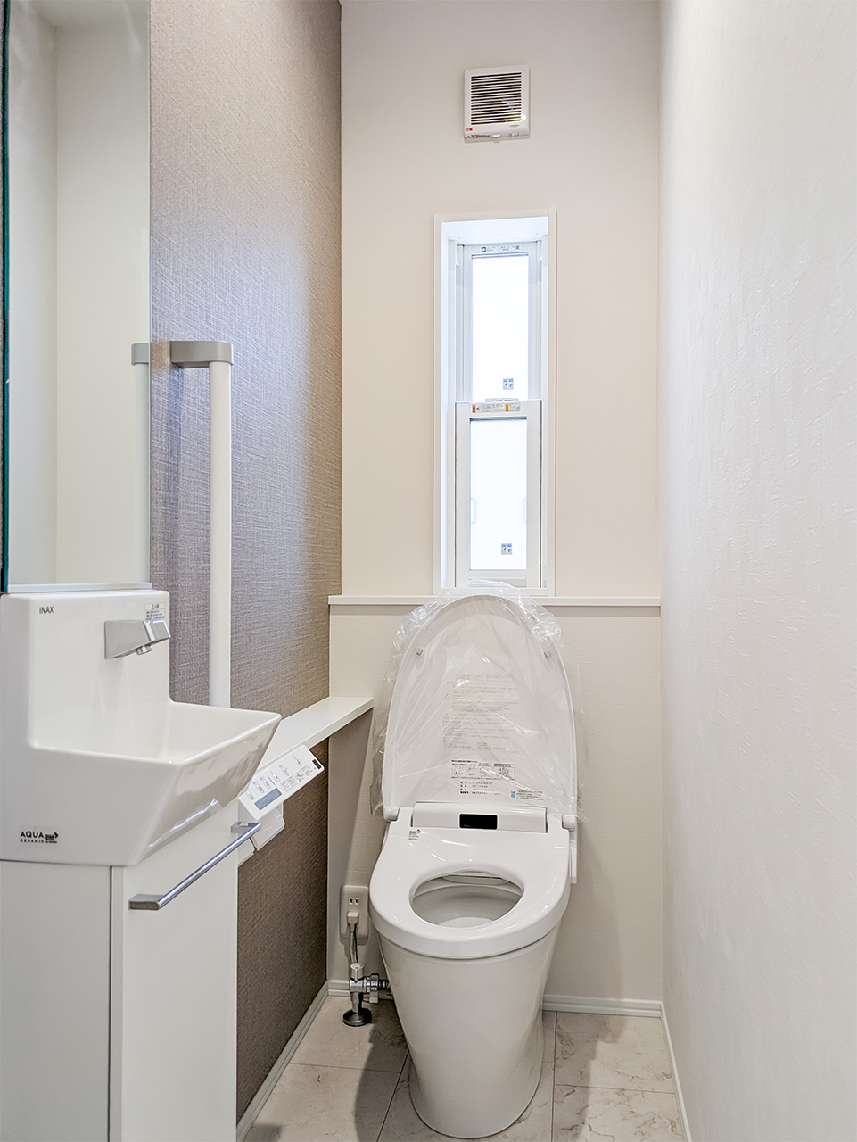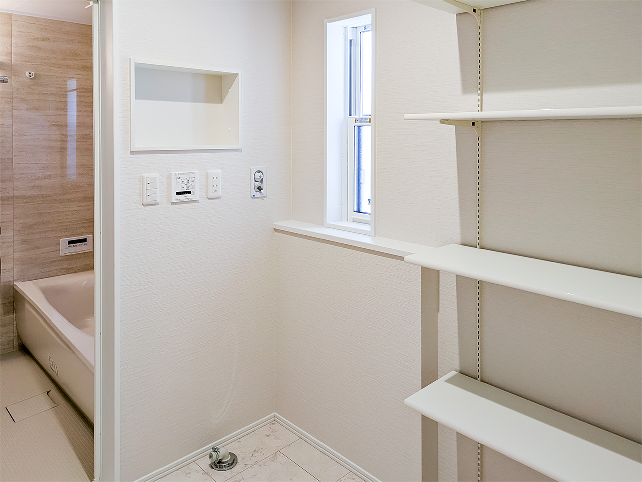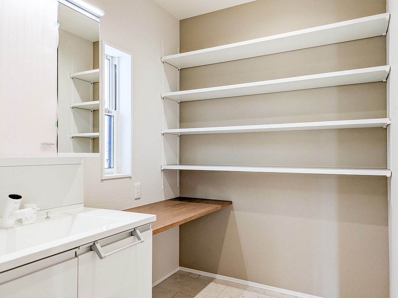 脱衣所と洗面所スペースをセパレートした独立洗面台。来客時など、あまり見せたくない洗濯機まわりを気にする事なく、洗面所を利用することができます。